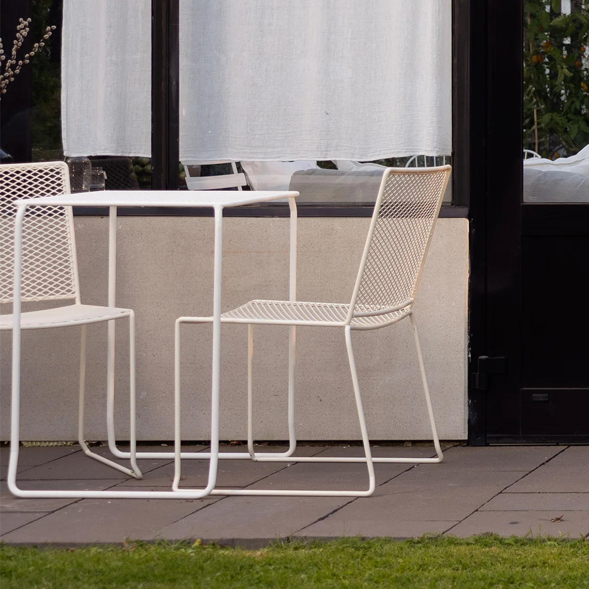 Bordet visas här i färgen Pärlvit – en mjukt vit nyans med en varm underton som ger ett elegant och tidlöst intryck. Färgen harmonierar fint med både ljusa och mörka miljöer och skapar en luftig, sofistikerad känsla på uteplatsen.