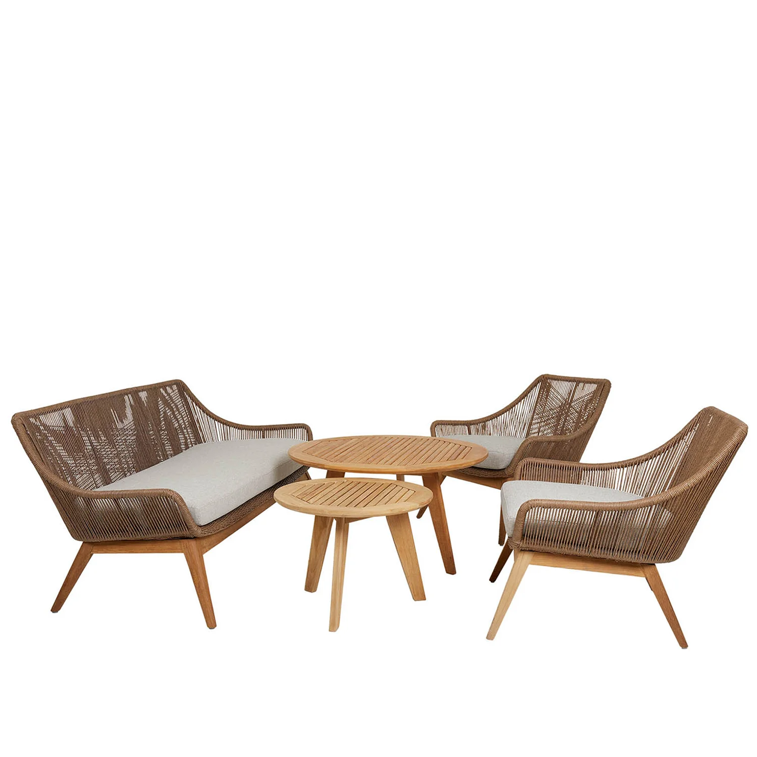 Hassel är en nätt soffgrupp med tidlös design i en varm och inbjudande stil, med ett dekorativt flätat ryggstöd i konstrotting och en klassisk stomme i teak. Här tillsammans med satsbordet Kastos i teak. Två vackra, lättplacerade soffbord i naturell teak som gör sig utmärkt tillsammans. Var flexibel och möblera modernt – skjut in det lilla bordet, som är lägre, en bit under det större.