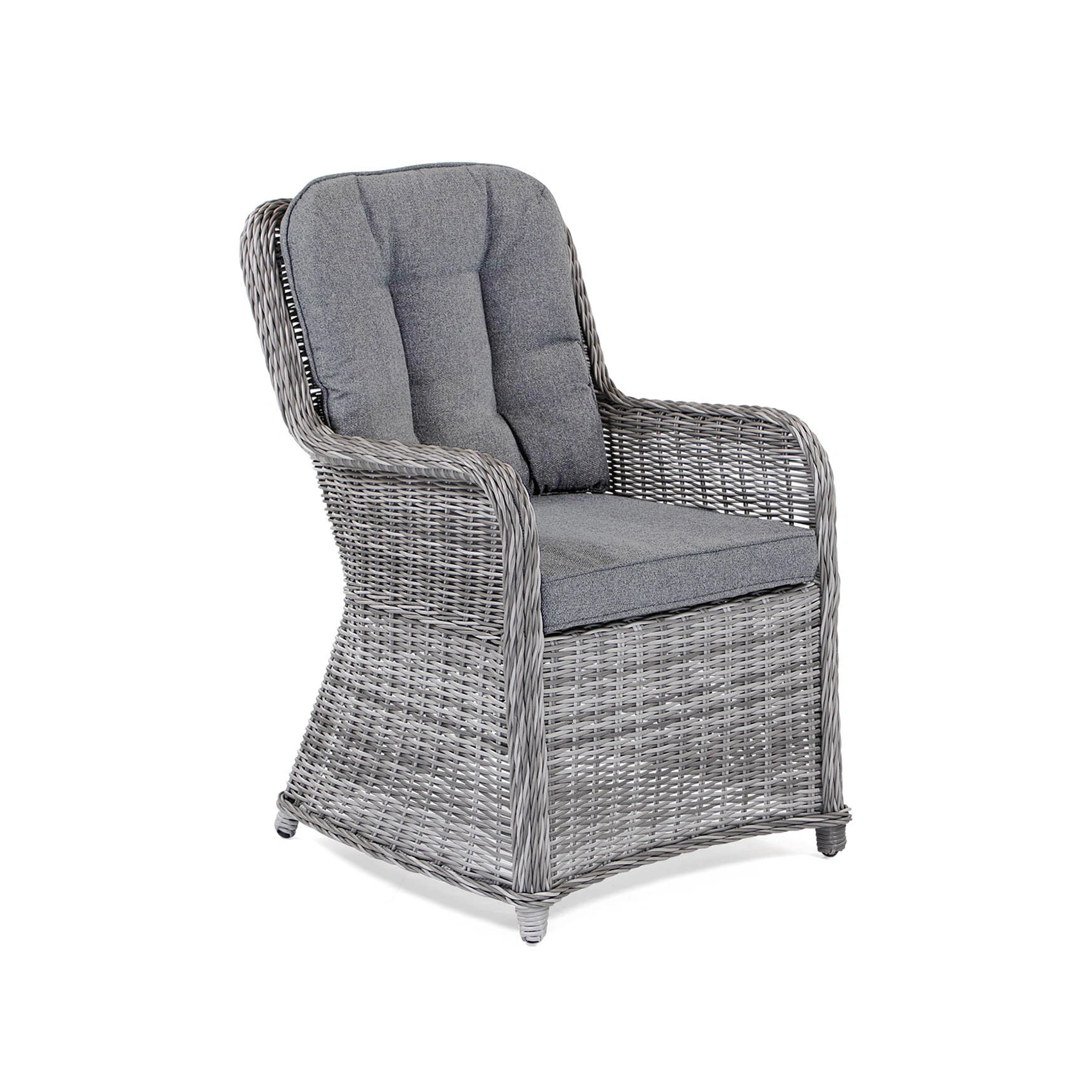 Hastings fåtölj i pärlgrå konstrotting på en kraftig aluminiumstomme. Sits- och ryggdyna i tålig olefinväv ingår.