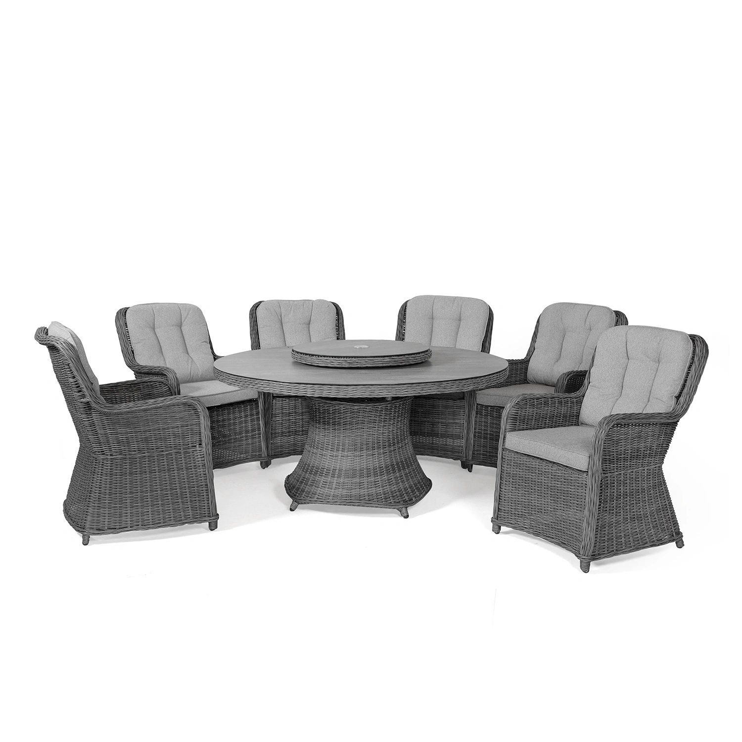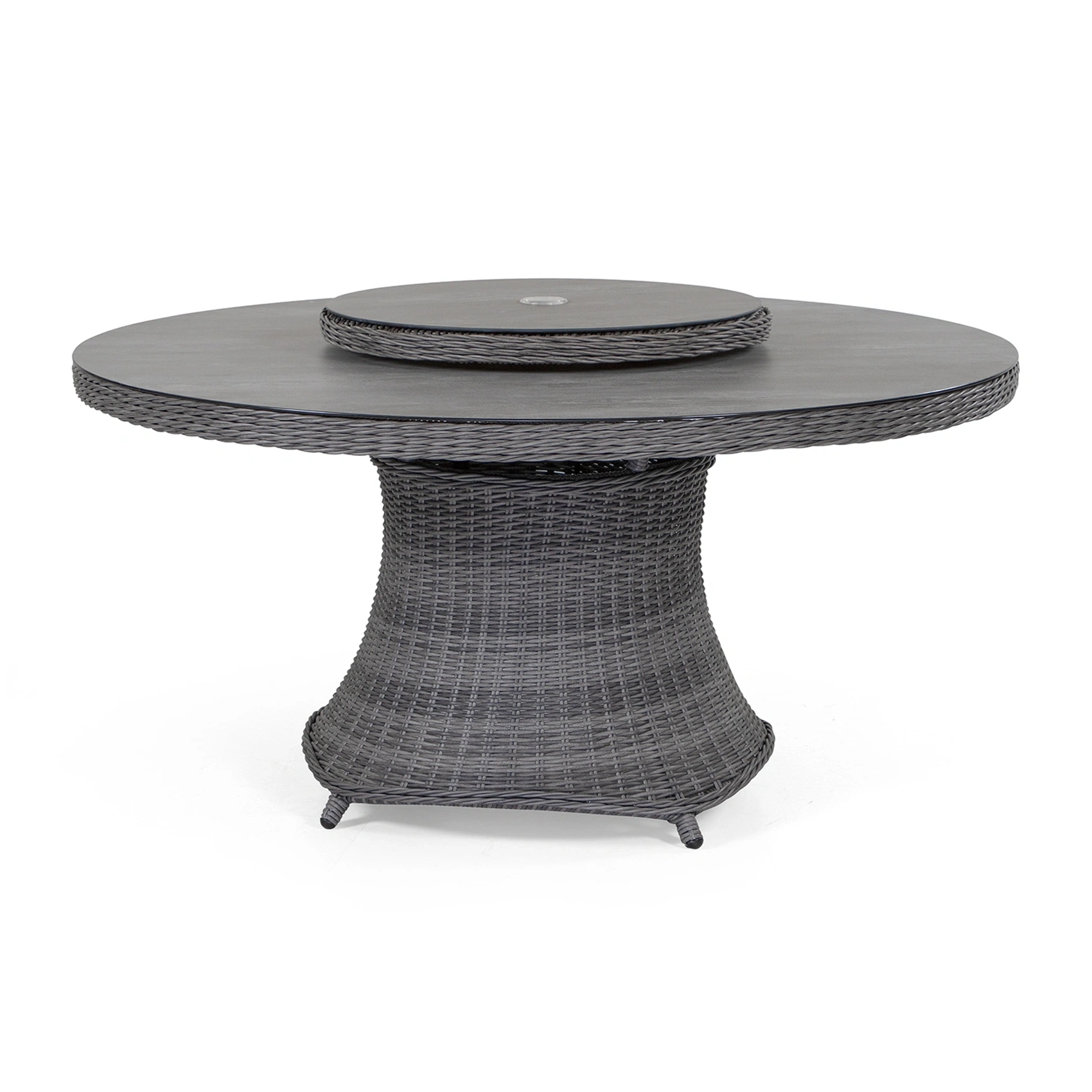 Hastings är ett runt matbord från Atleve som kombinerar generös rymd med hög funktionalitet och ett tidlöst uttryck. Bordet har en stadig stomme i pulverlackerad aluminium i färgen antracit, flätad med antracitgrå rund konstrotting som ger en varm och inbjudande känsla. Den mörkgrå bordsskivan i härdat glas skapar en elegant kontrast och är både slitstark och lätt att hålla ren. Tack vare den generösa diametern på 150 cm finns gott om plats för fem till åtta stolar – perfekt för stora sällskap, familjemiddagar eller sociala stunder utomhus. Bordet levereras dessutom med en praktisk snurrskiva i matchande design, och både bordsskivan och snurrskivan har parasollhål på 50 mm.