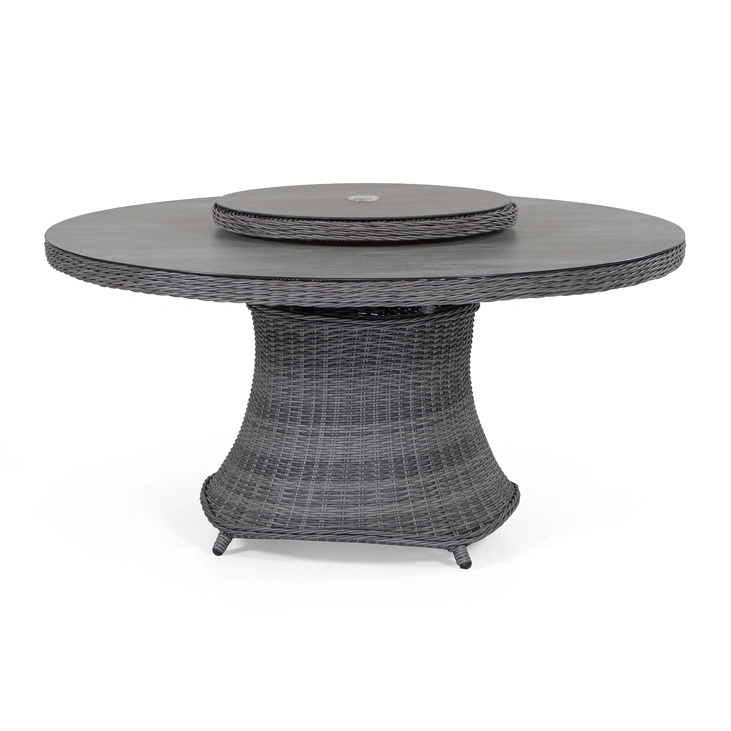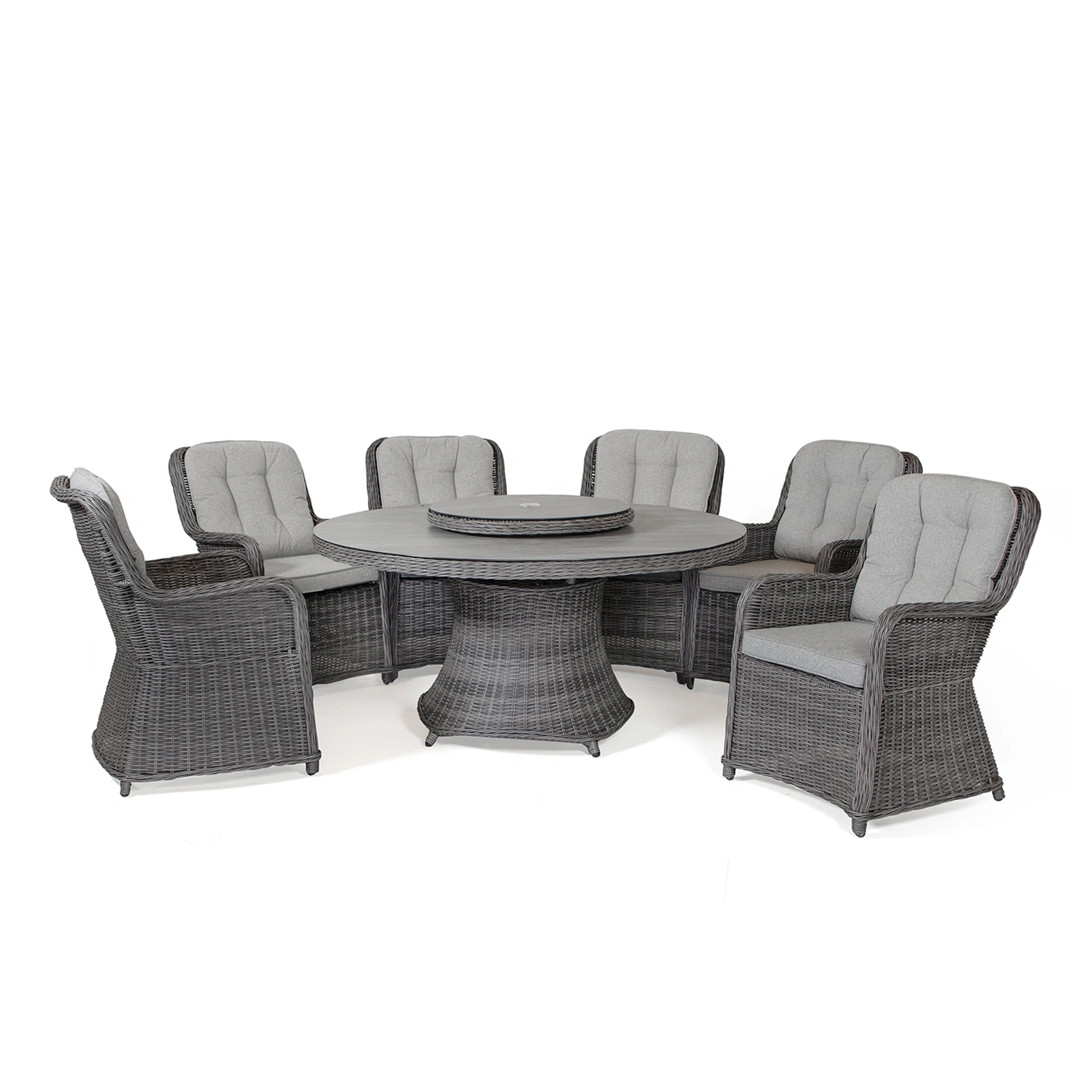 Hastings fåtölj i antracitgrå konstrotting tillsammans med Hasting matbord i storlek Ø150 cm med snurrskiva i mitten. Tack vare den generösa diametern på 150 cm finns gott om plats för fem till åtta stolar – perfekt för stora sällskap, familjemiddagar eller sociala stunder utomhus. Bordet levereras dessutom med en praktisk snurrskiva i matchande design, och både bordsskivan och snurrskivan har parasollhål på 50 mm. Stolarna levereras med dynor i ljusgrått olefintyg.