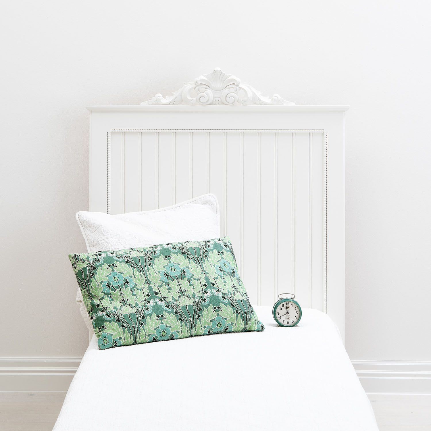 Herrgårdens romantiska sänggavel med pärlstav och pärlspont. Finns i flera bredder och kan dekoreras med krön. Pryder verkligen ett vackert sovrum.
