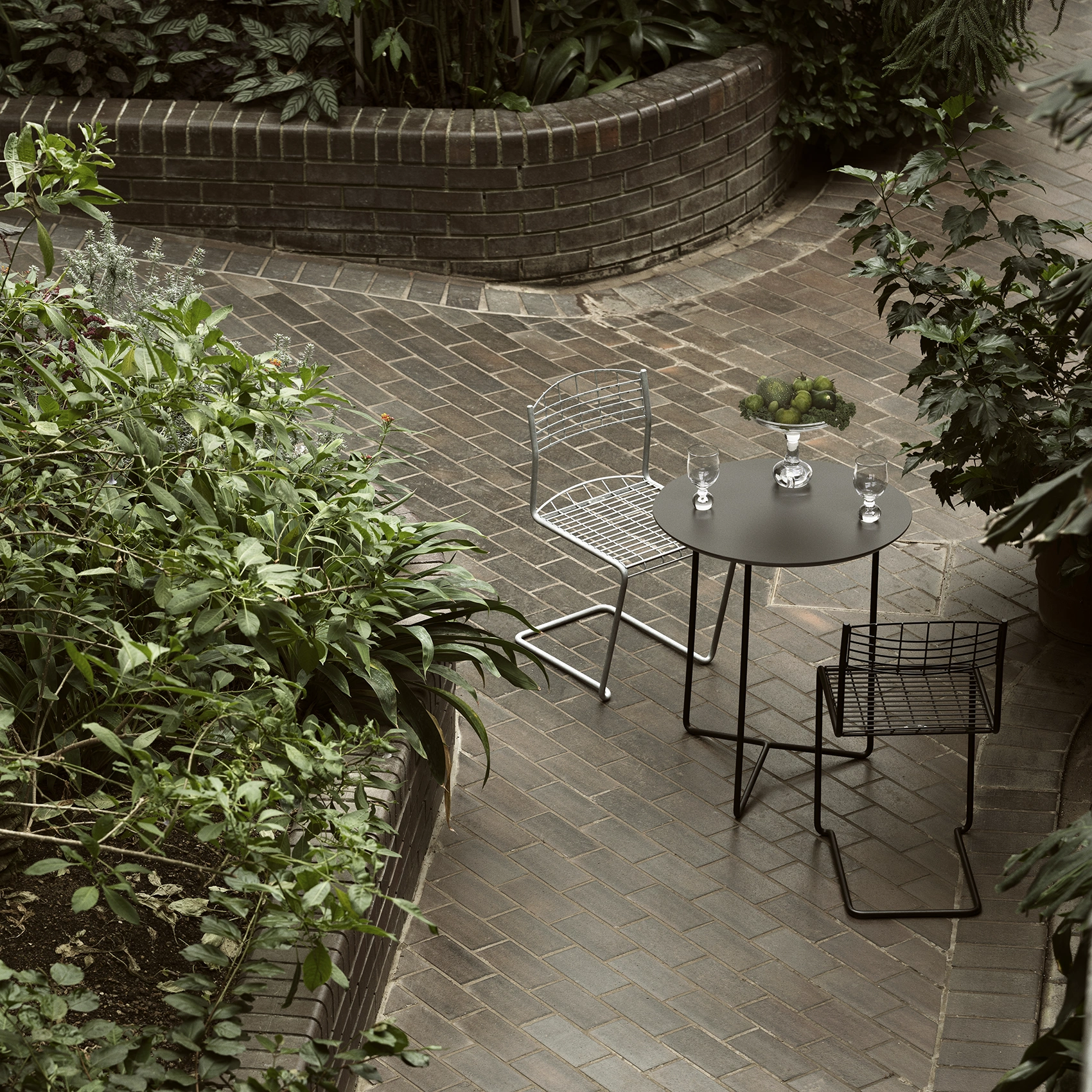 Nisse Strinnings stolklassiker, High-Tech, har även ett tillhörande mindre runt bord. Gjord i massivt stål med skiva av tåligt kompaktlaminat som klarar alla väderlekar. Bordet har avtagbara ben.
