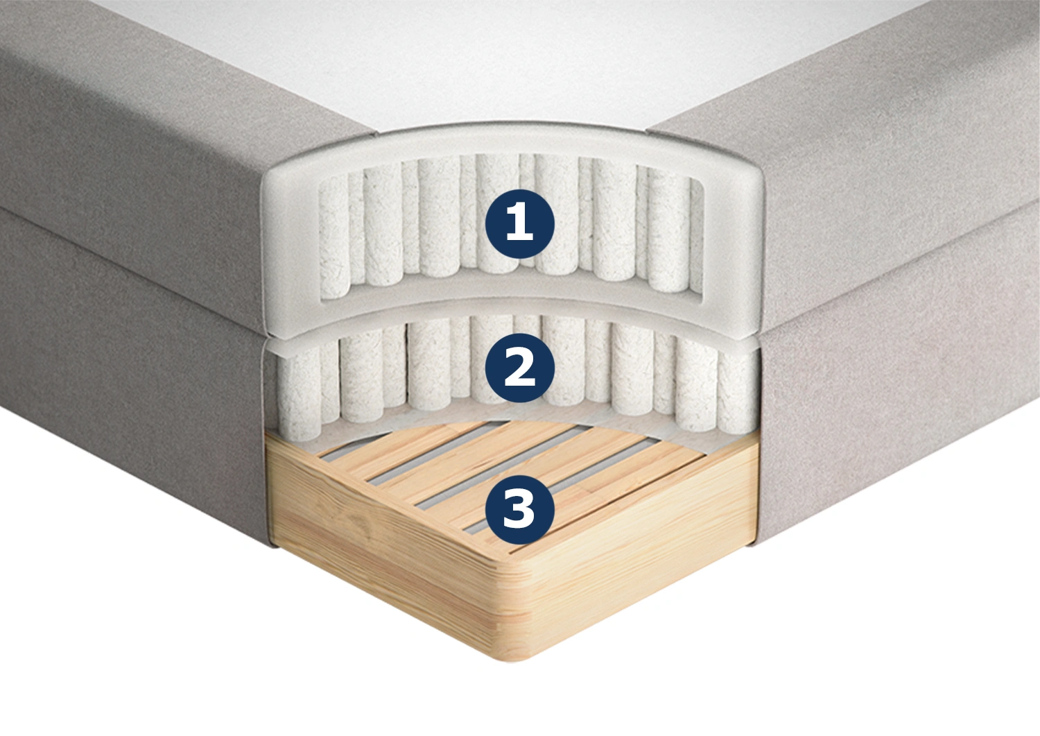 Sängen har en 5-zons pocketresår som ger anpassat stöd för hela kroppen. Midjezonen är fastare för att stabilisera höfter och rygg, medan axelzonen är mjukare för att ge en mer avslappnad position för axlarna. Detta gör att sängen formar sig efter kroppens konturer och ger en balanserad liggkänsla.