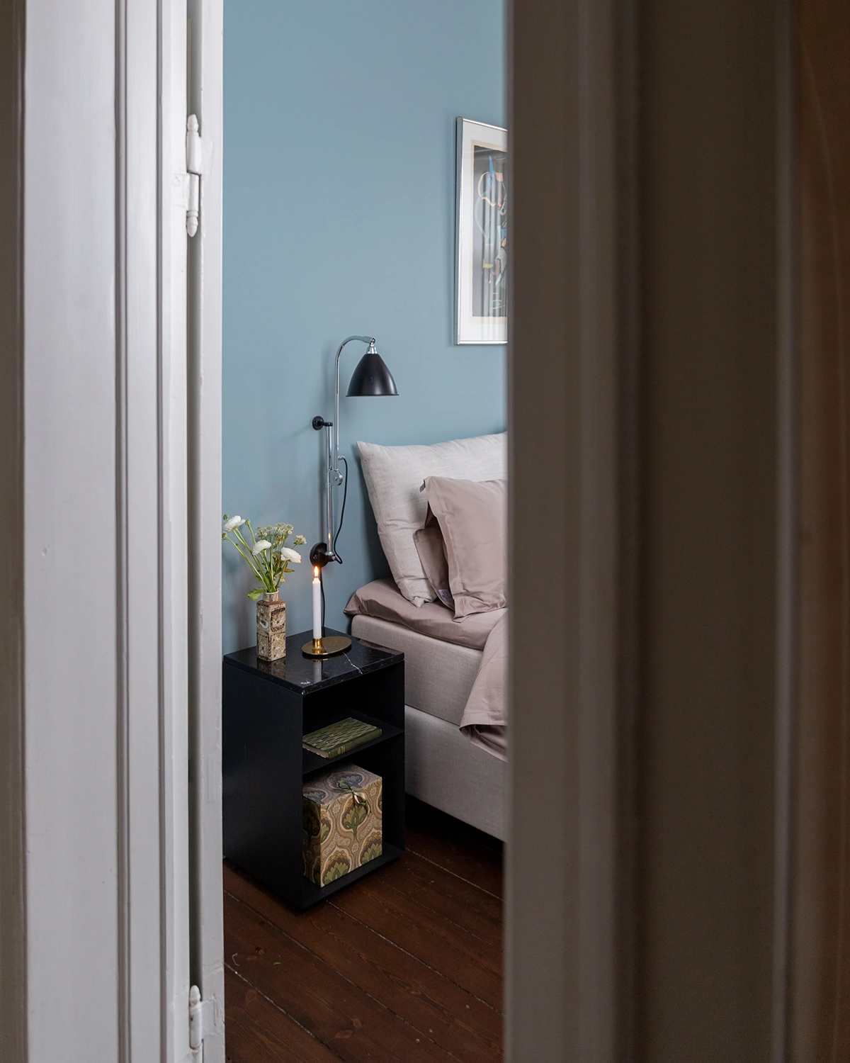 Här visas sängbordet med skiva i marmor. Den svarta marmorskivan är särskilt utvald för att matcha Holme sängbord. Marmorskivans uttryck förstärks av en diskret ådring som är unik för varje exemplar. Marmorskivans dramatiska utseende bidrar till en lyxig helhet som perfekt matchar sängbordens moderna elegans.