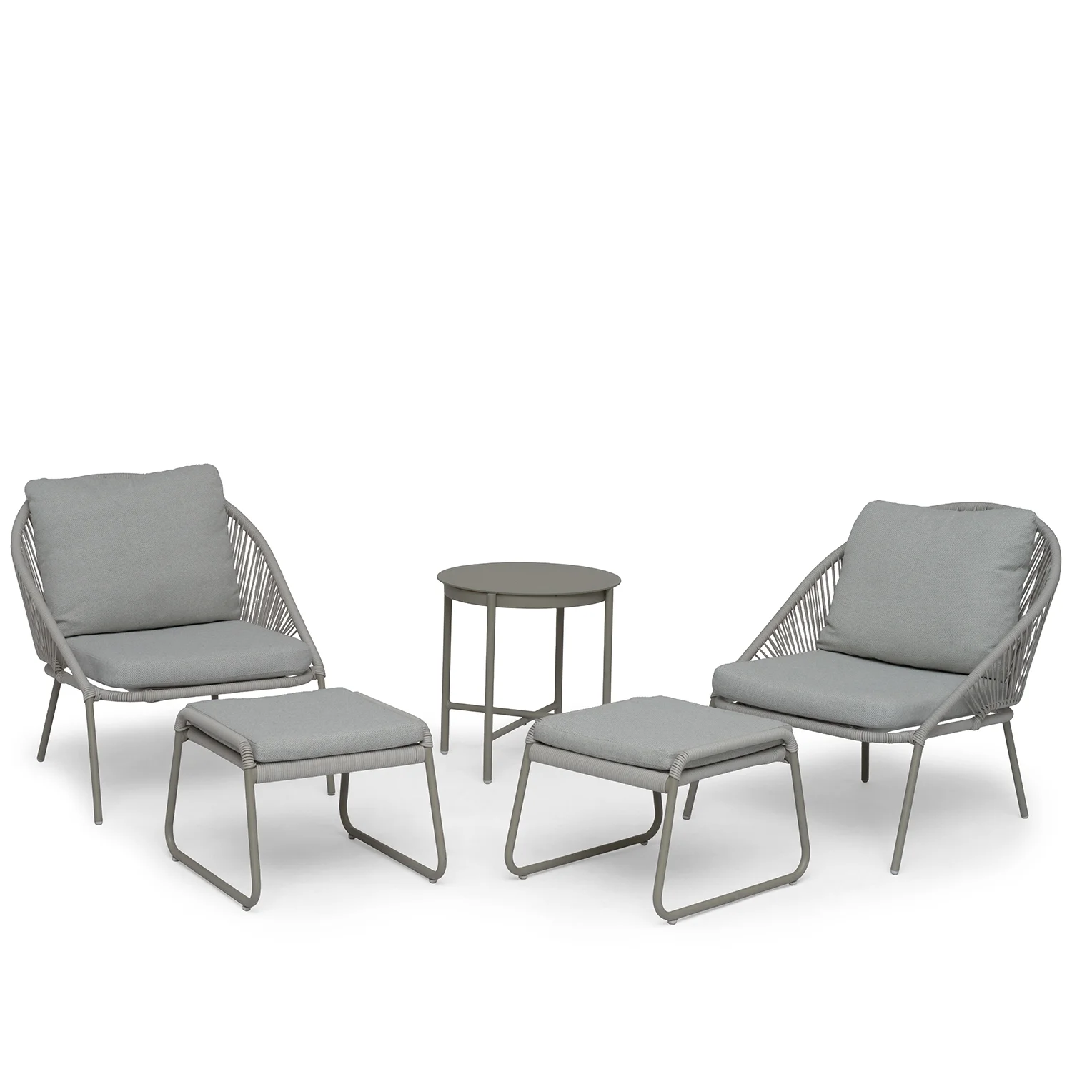 Mindre nätt fåtöljgrupp i modernt och sobert utförande. Passar lika bra på den mindre uteplatsen som på balkongen eller i favorithörnan i trädgården. Komplett set innehållande två fåtöljer, två fotpallar och ett bord. Tillverkad i aluminium med rep och dynor i beige olefin med hög textur. Bordsskiva i glas.
