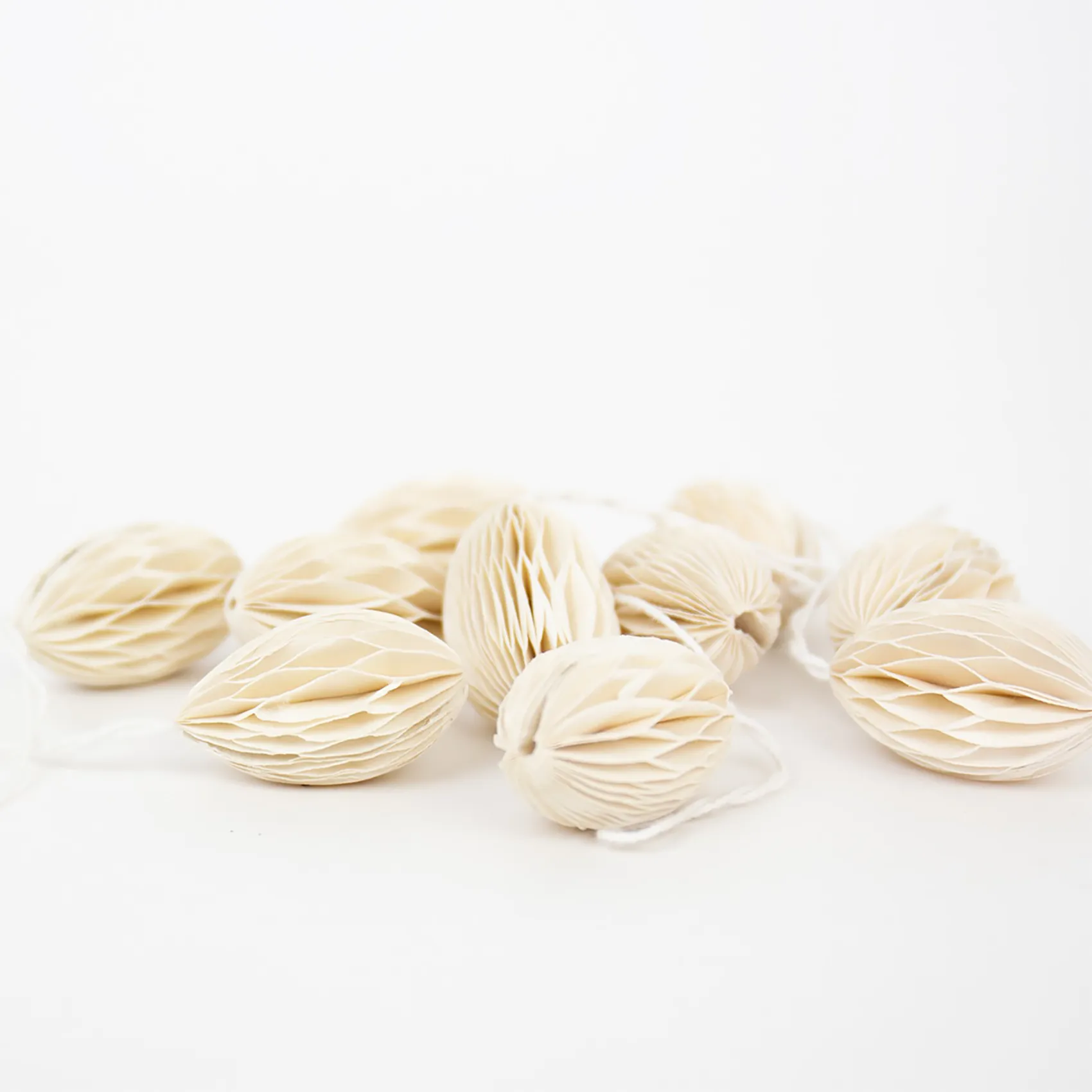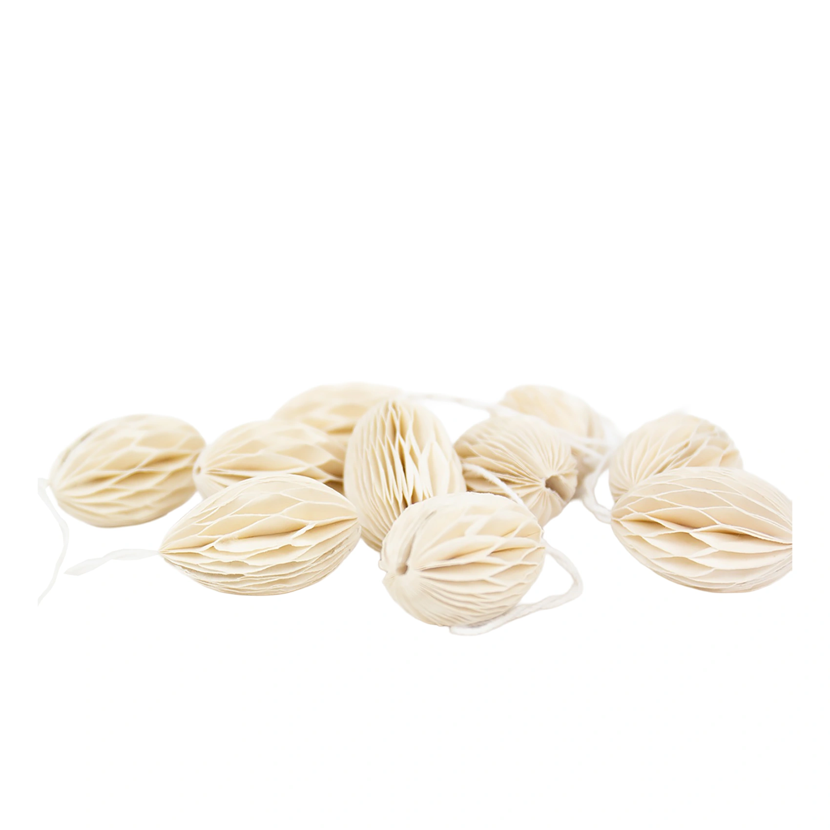 10 små vita ägg i en liten papperslåda. Papperstillverkningen skapar angelägen sysselsättning för framförallt kvinnor på landsbygden.