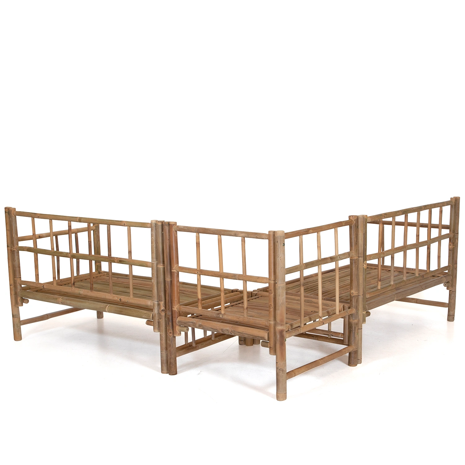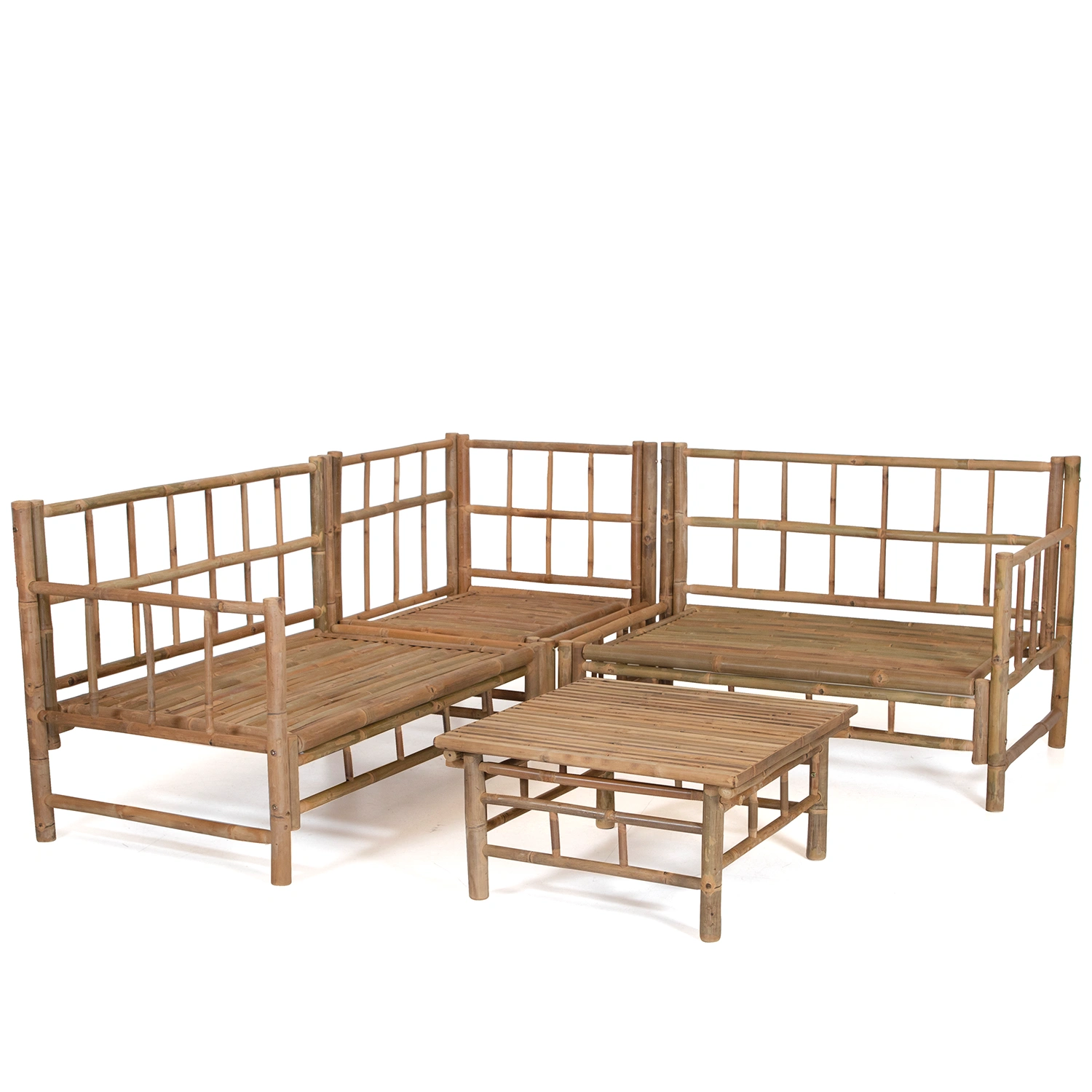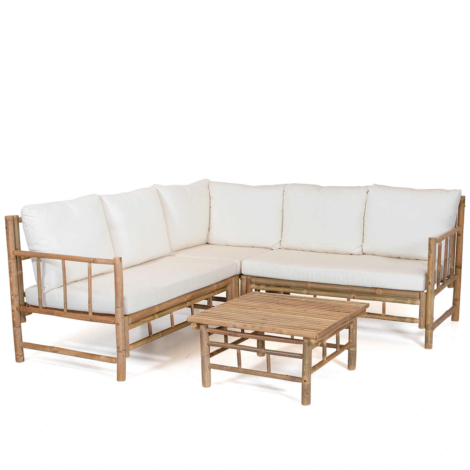 Hörnsoffgrupp tillverkad i bambu med dynor i offwhite. I gruppen ingår en en hörnsoffa (hörnsoffan kommer i tre delar, 2 stycken avslut och 1 hörndel) och ett fyrkantigt soffbord.