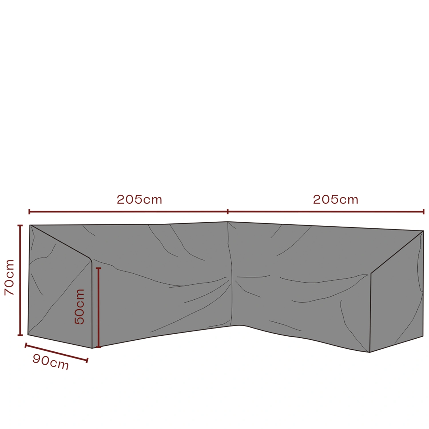 Detta möbelskydd passar liksidiga hörnsoffor med längd till höger och vänster på upp till 205 cm. Passar bland annat till hörnsoffan Soho från Brafab. Produktbild visar alla måtten korrekt.