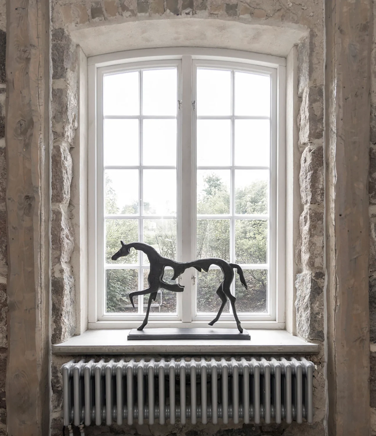 Statyett tillverkad i metall i form av en majestätisk häst med detaljer och en strukturerad yta. Skulpturen tillför en touch av elegans och sofistikering till vilket rum som helst och blir en framstående dekorativ pjäs.