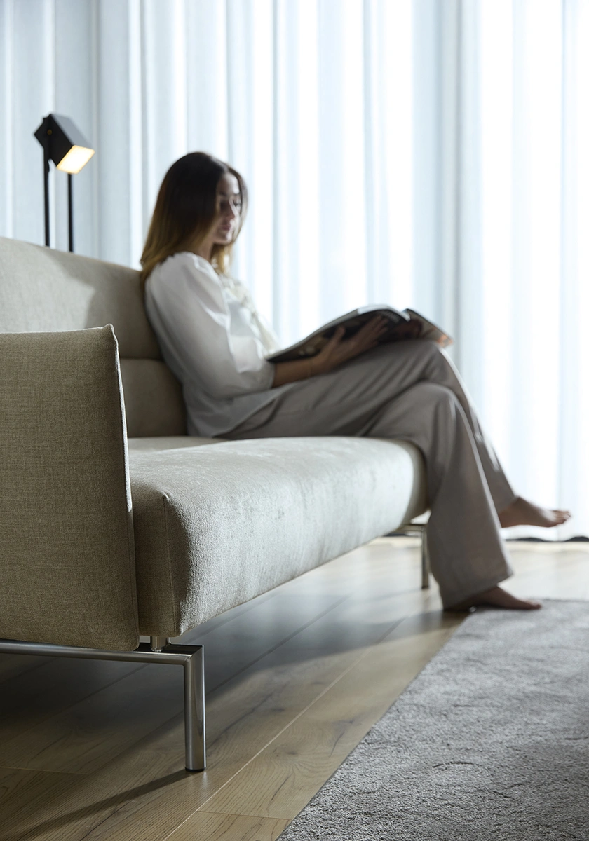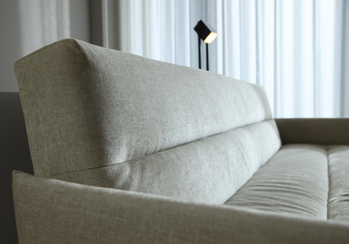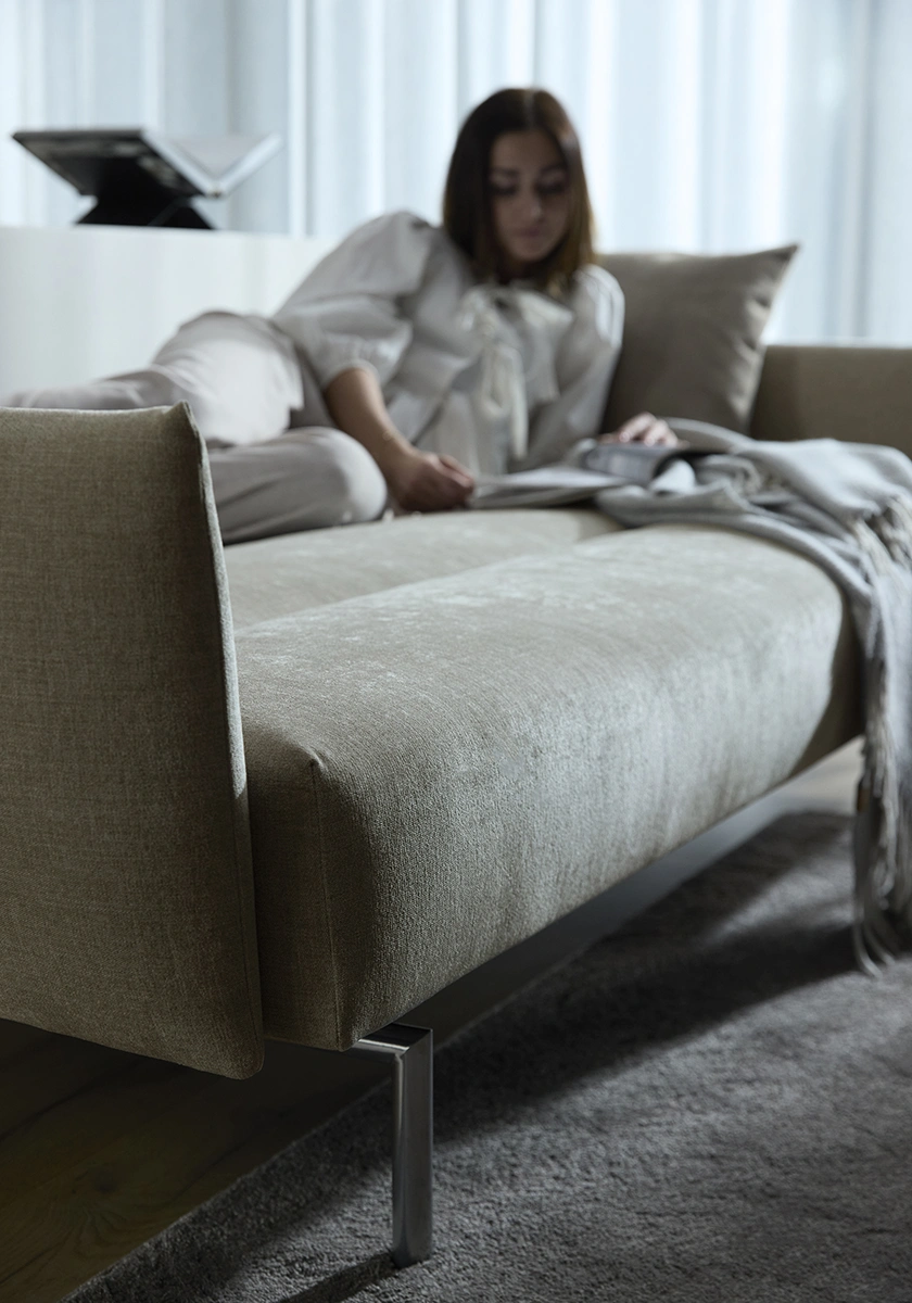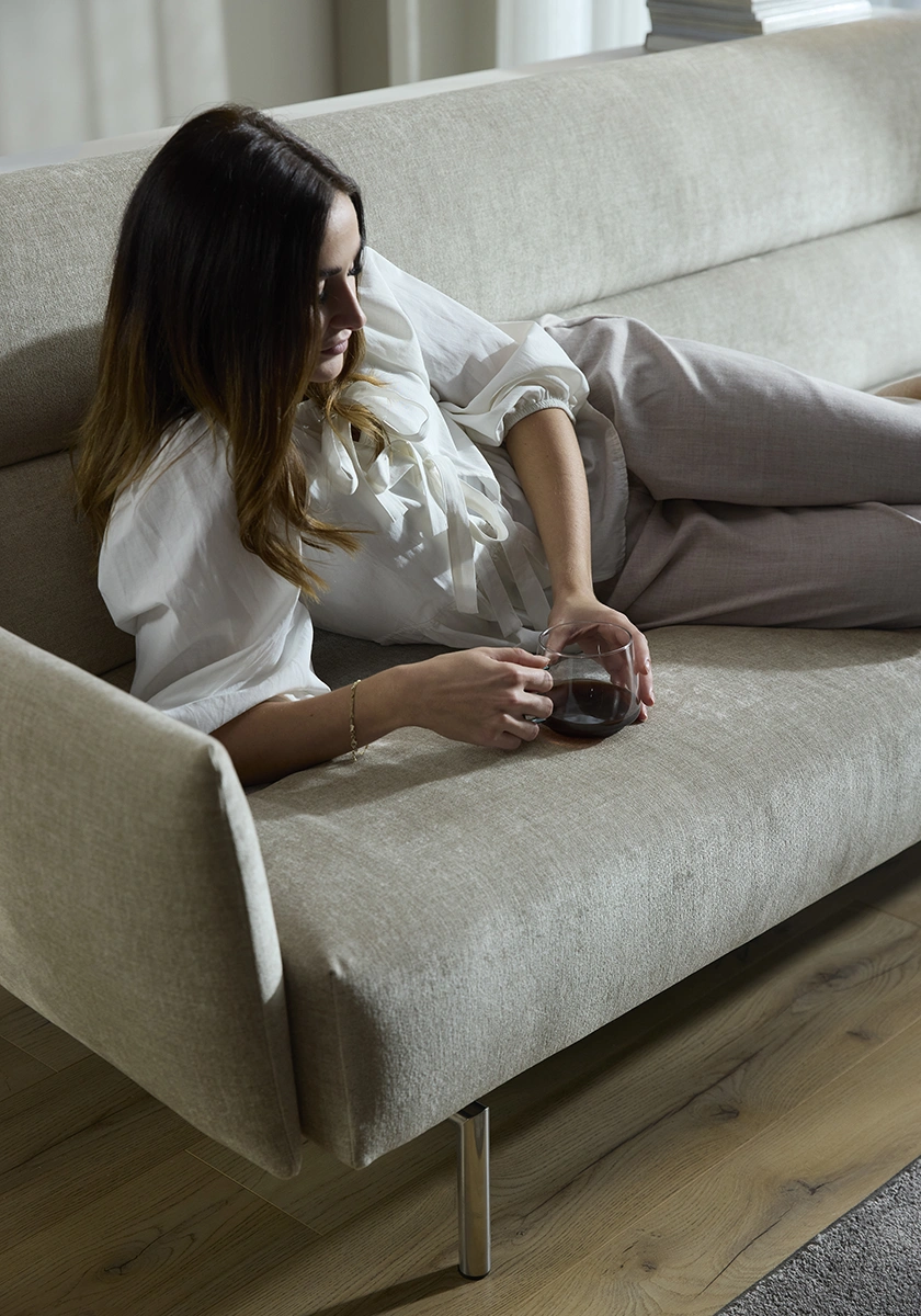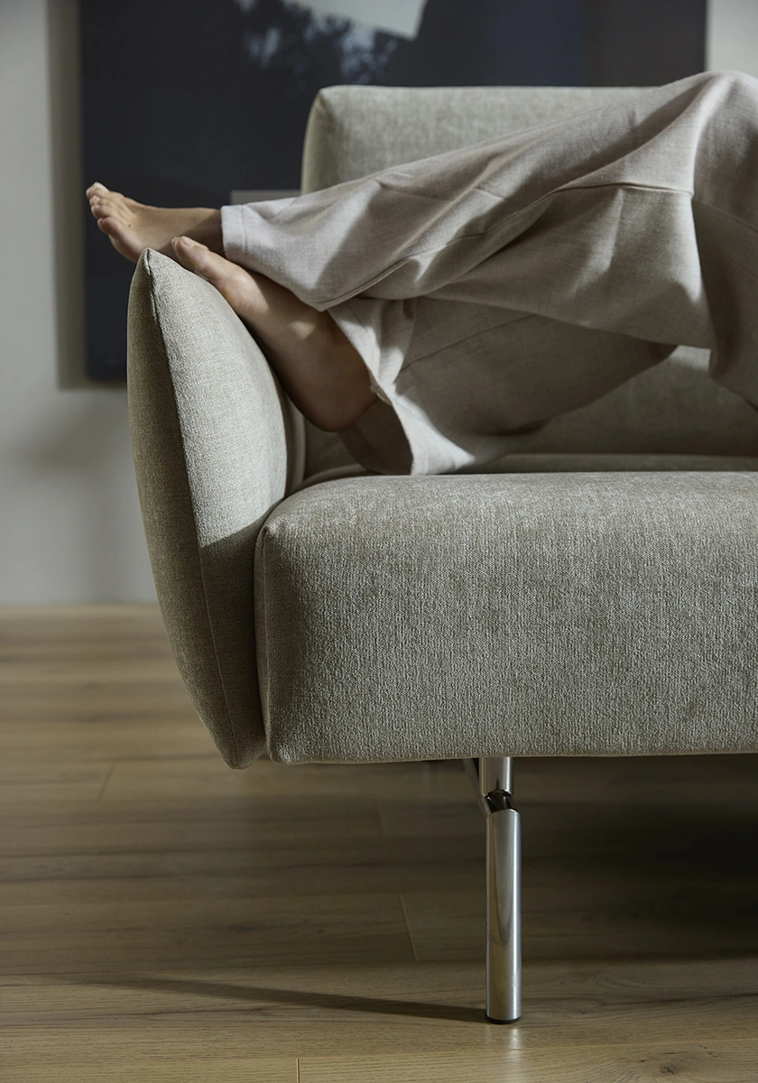 Den smala, strukturerade silhuetten kompletteras av polerade kromben och noggrant utformade kanalsömmar på klädseln, vilket ger en raffinerad touch till alla utrymmen. Under dess eleganta exteriör ger no-zag-fjädrar och högfjädrande skum exceptionellt stöd och komfort. Jillis förvandlas utan ansträngning från en snygg soffa till en bekväm säng, vilket gör den till ett utmärkt val för alla vardagsrum. Dess genomtänkta proportioner säkerställer maximal komfort utan att kompromissa med estetiken. Oavsett om du kopplar av, arbetar eller tar emot gäster, är Jillis ett mångsidigt, sofistikerat tillskott som anpassar sig till din livsstil med enkel charm.