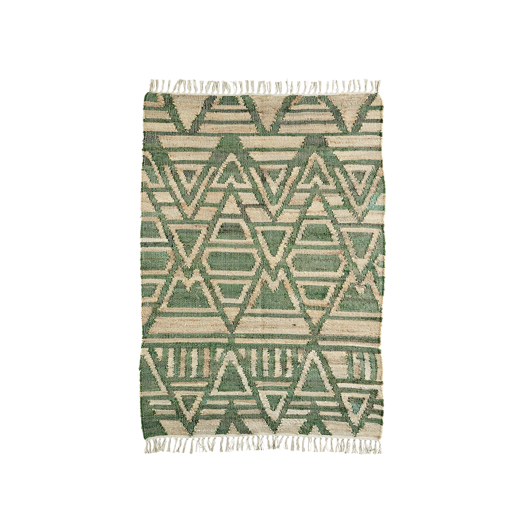 Handflätad matta tillverkad i jute (80% Jute, 20% Bomull) med mönster i grönt och natur.