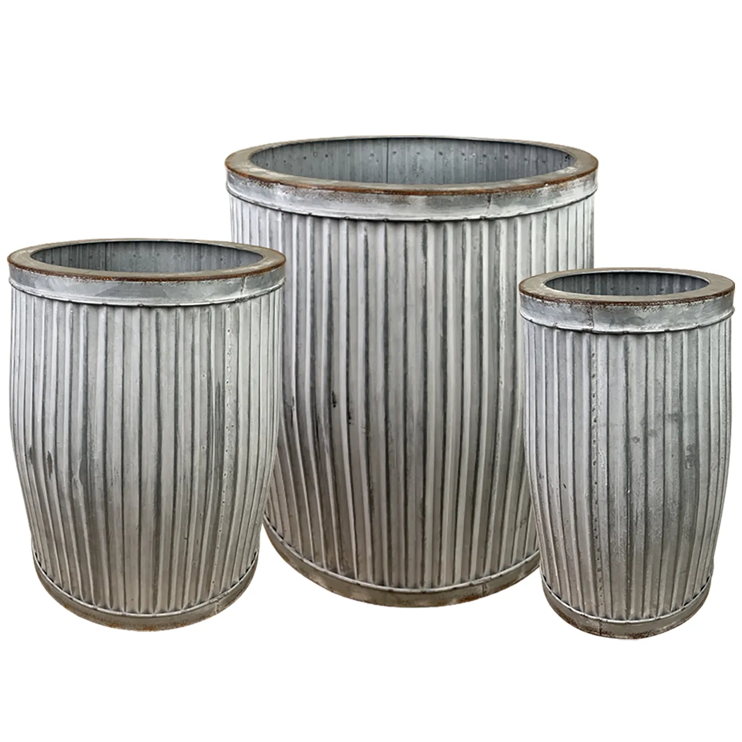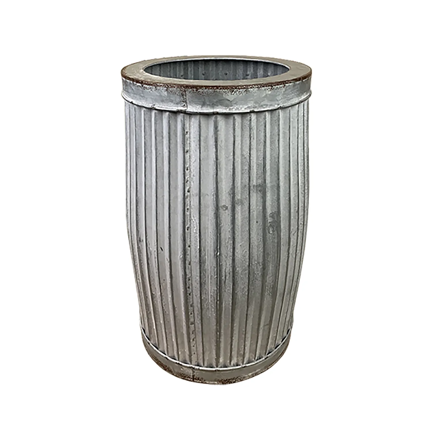En hög och rund ytterkruka i zink från Västanvinden, med räfflad yta och en markerad kant på cirka 2 cm. Den smala siluetten gör den särskilt lämplig för växter med höjd, som gräs, mindre träd eller blommande stjälkar.