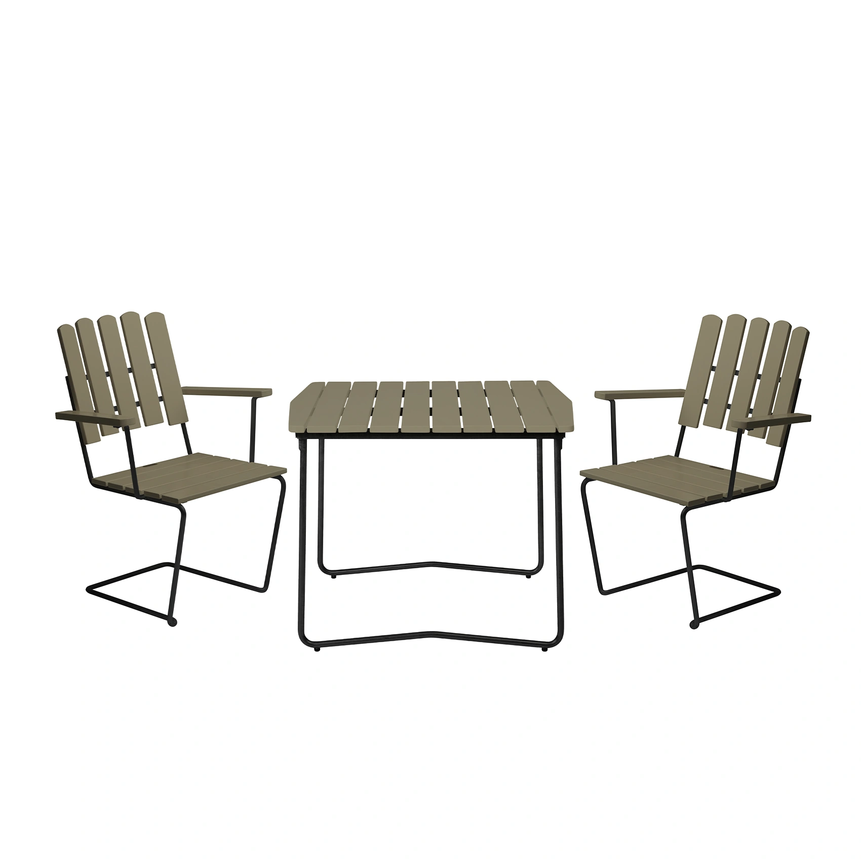 Här visas en matgrupp med de populära A2 stolarna och matbordet B31 84 i ljusgrön-målad ek med pulverlackerat matt svart stativ. B31 84 är ett nätt bord som är perfekt för den lilla balkongen eller uteplatsen. Lägg till fler A2 stolar eller någon annan Grythyttan stol för att få fler sittplatser.