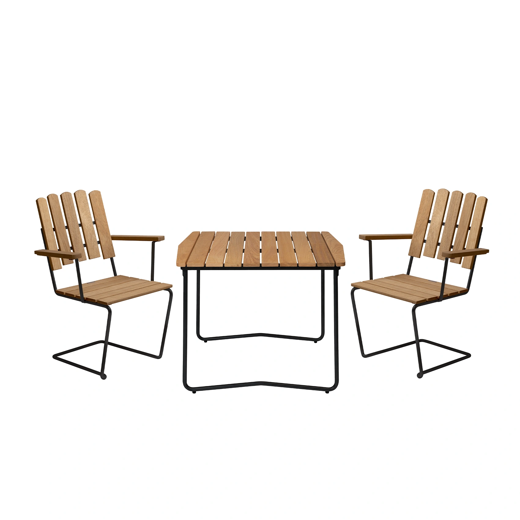 Här visas en matgrupp med de populära A2 stolarna och matbordet B31 84 i oljad ek med pulverlackerat matt svart stativ. B31 84 är ett nätt bord som är perfekt för den lilla balkongen eller uteplatsen. Lägg till fler A2 stolar eller någon annan Grythyttan stol för att få fler sittplatser.