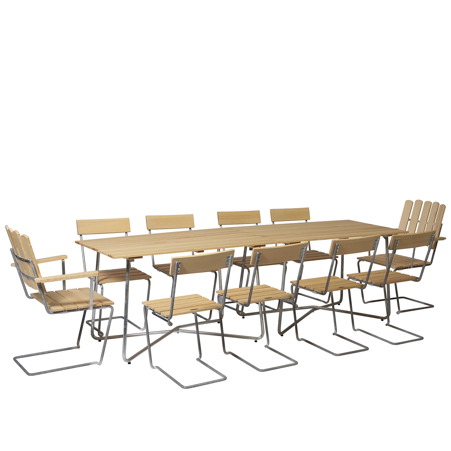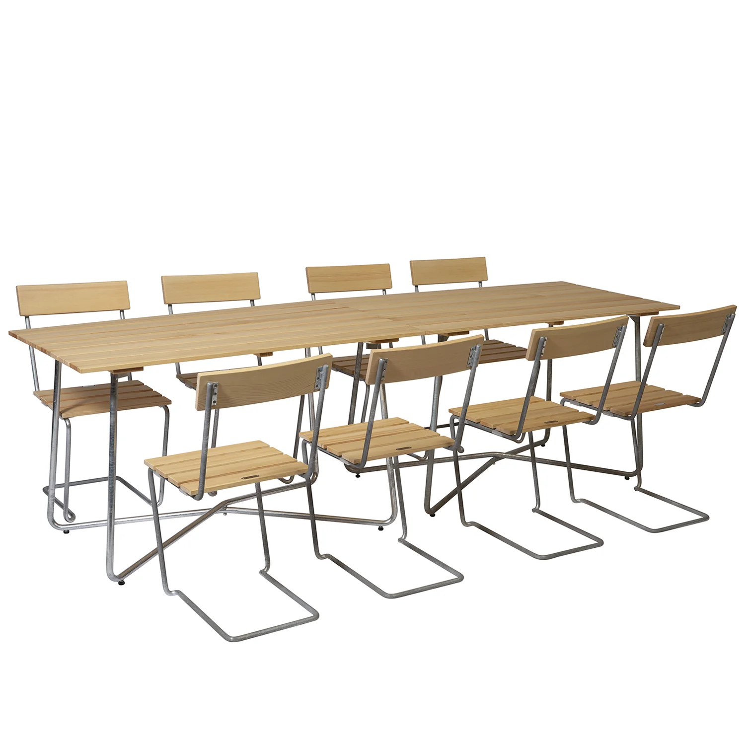 Här visas en matgrupp med Stol 1 och matbordet B25A i oljad furu och med varmförzinkade stativ.