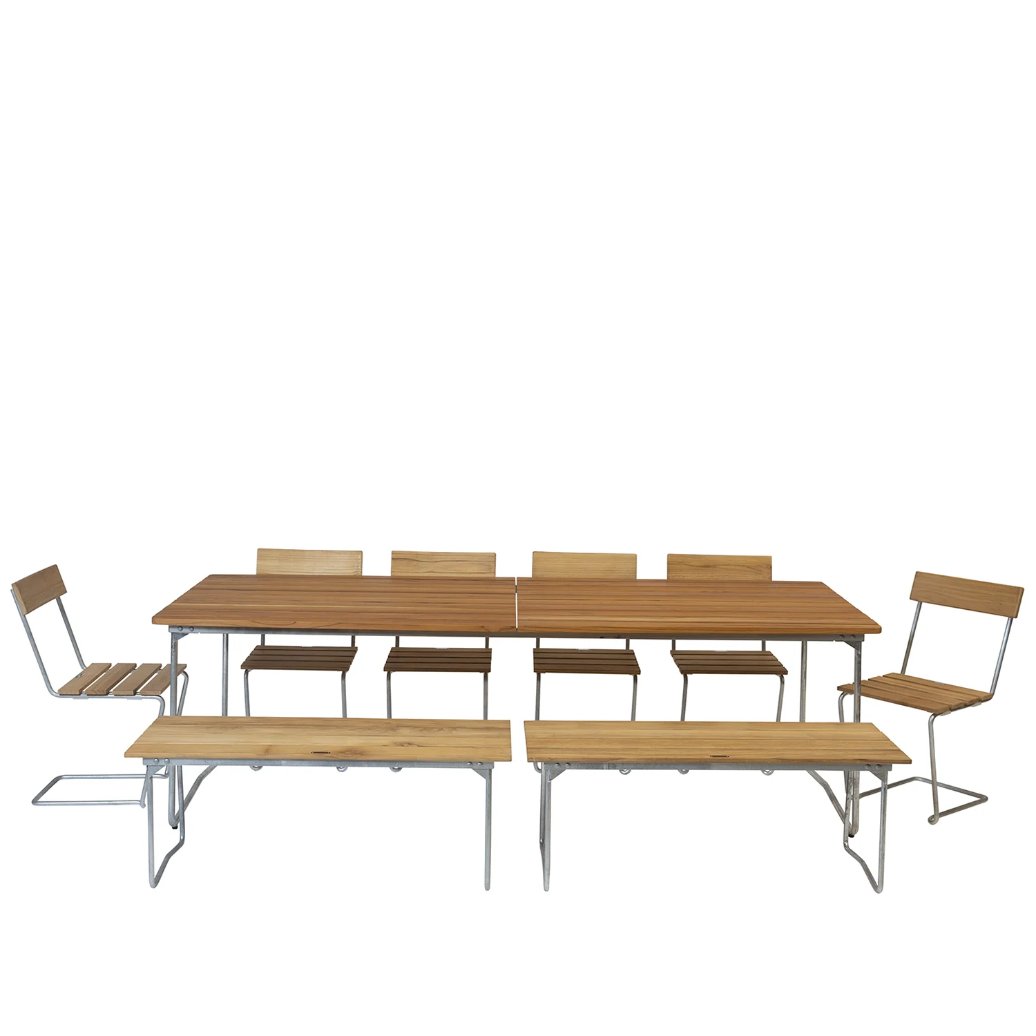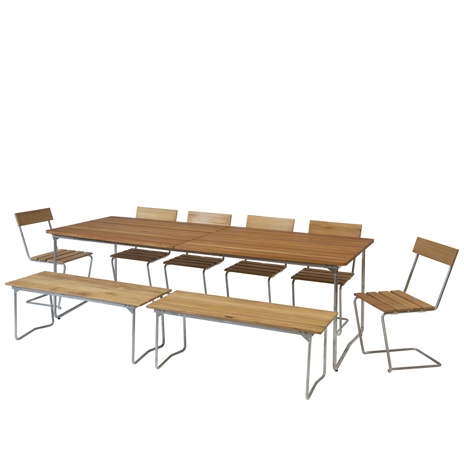 Här visas en matgrupp med den mindre Grythyttan stolen Stol 1, två Bänk 8 och matbordet B31 230 i obehandlad teak med varmförzinkat stativ. B31 230 är Grythyttans största bord och passar till 6-10 personer. På långsidan får man plats med tre stycken A2, två bänk 8 eller fyra stycken Stol 1. Lägg till ett B31 bord i storleken 84 eller 170 samt fler stolar för att utöka med fler sittplatser.