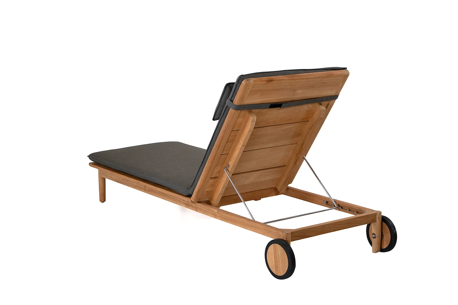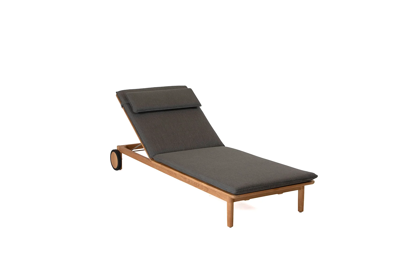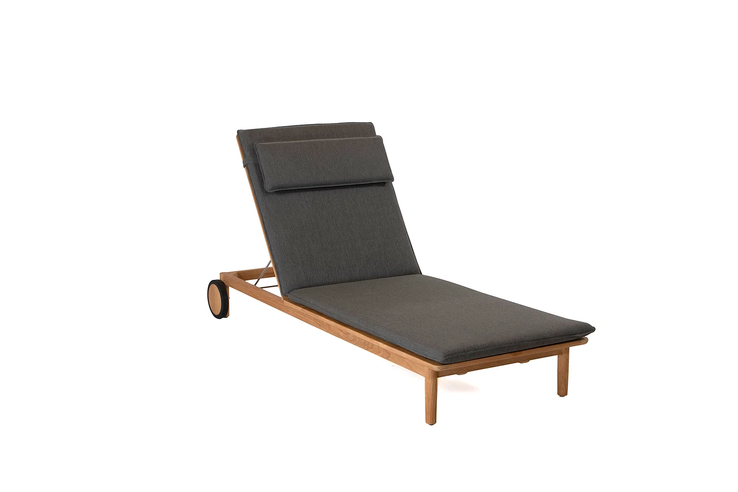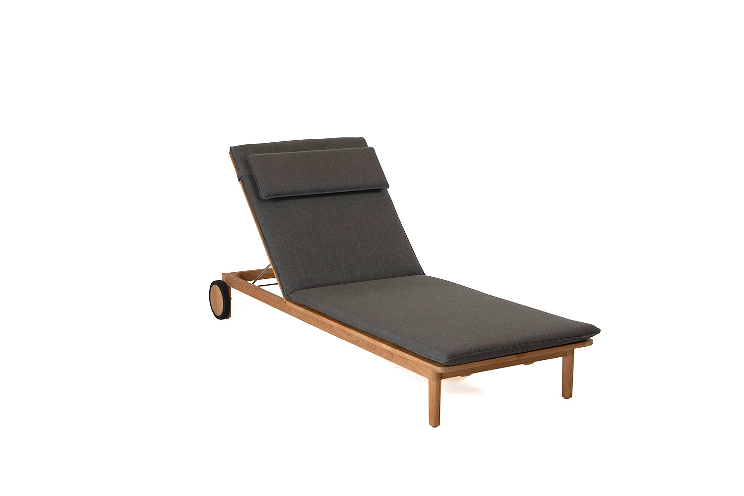 Koster solsäng i teak i klassisk skandinavisk stil med dyna i olefin-tyg i färgen Southend gråbrun.