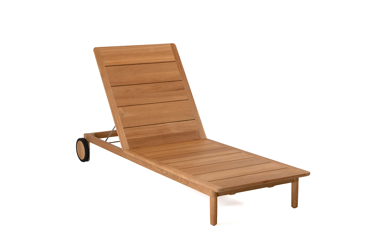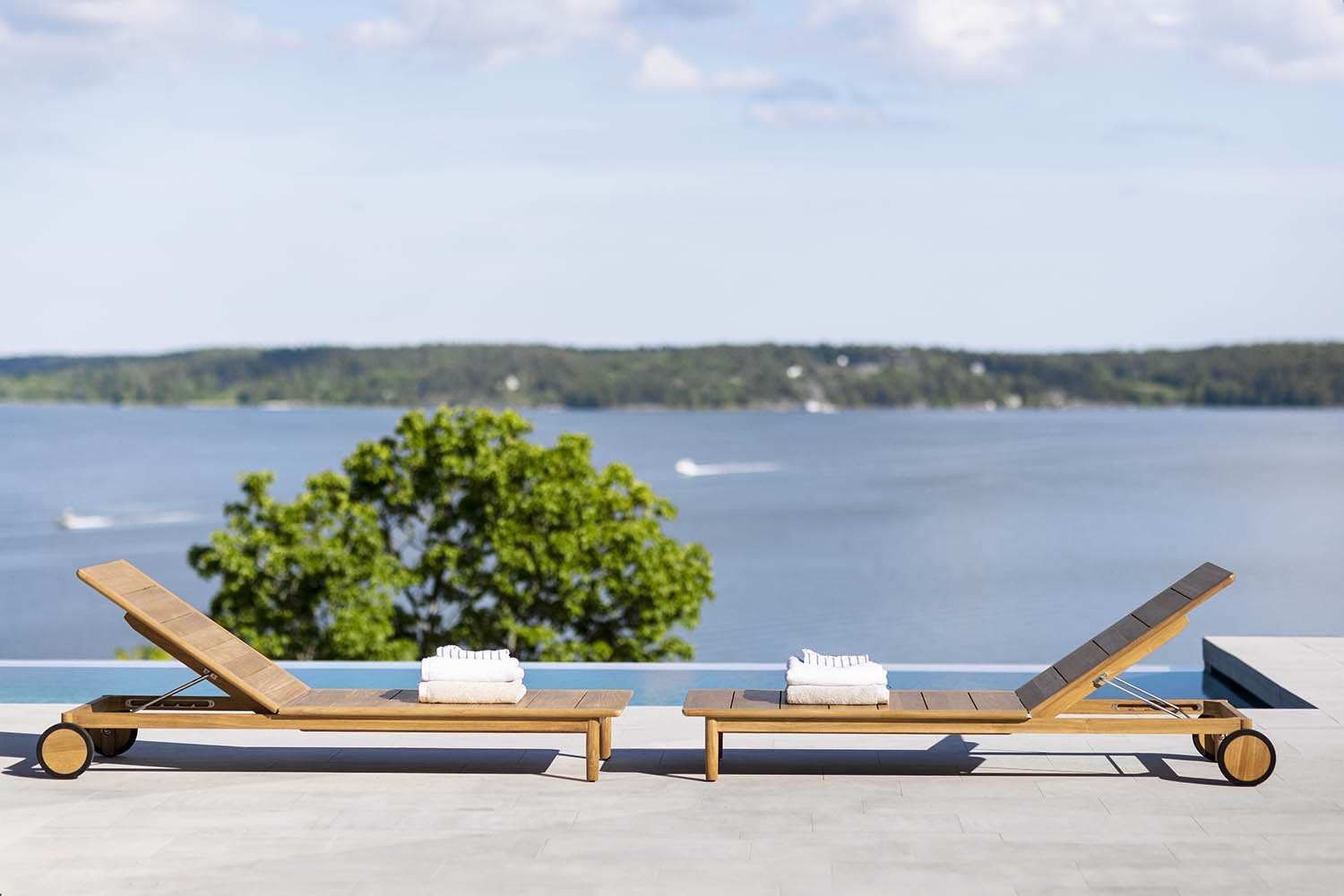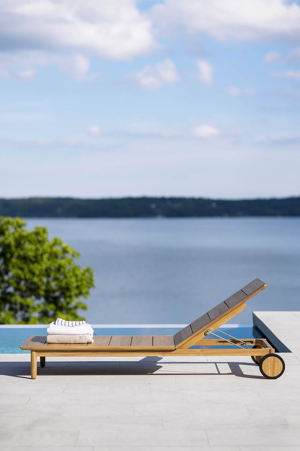 Koster solsäng i teak i klassisk skandinavisk stil med dyna i olefin-tyg i färgen Southend gråbrun.