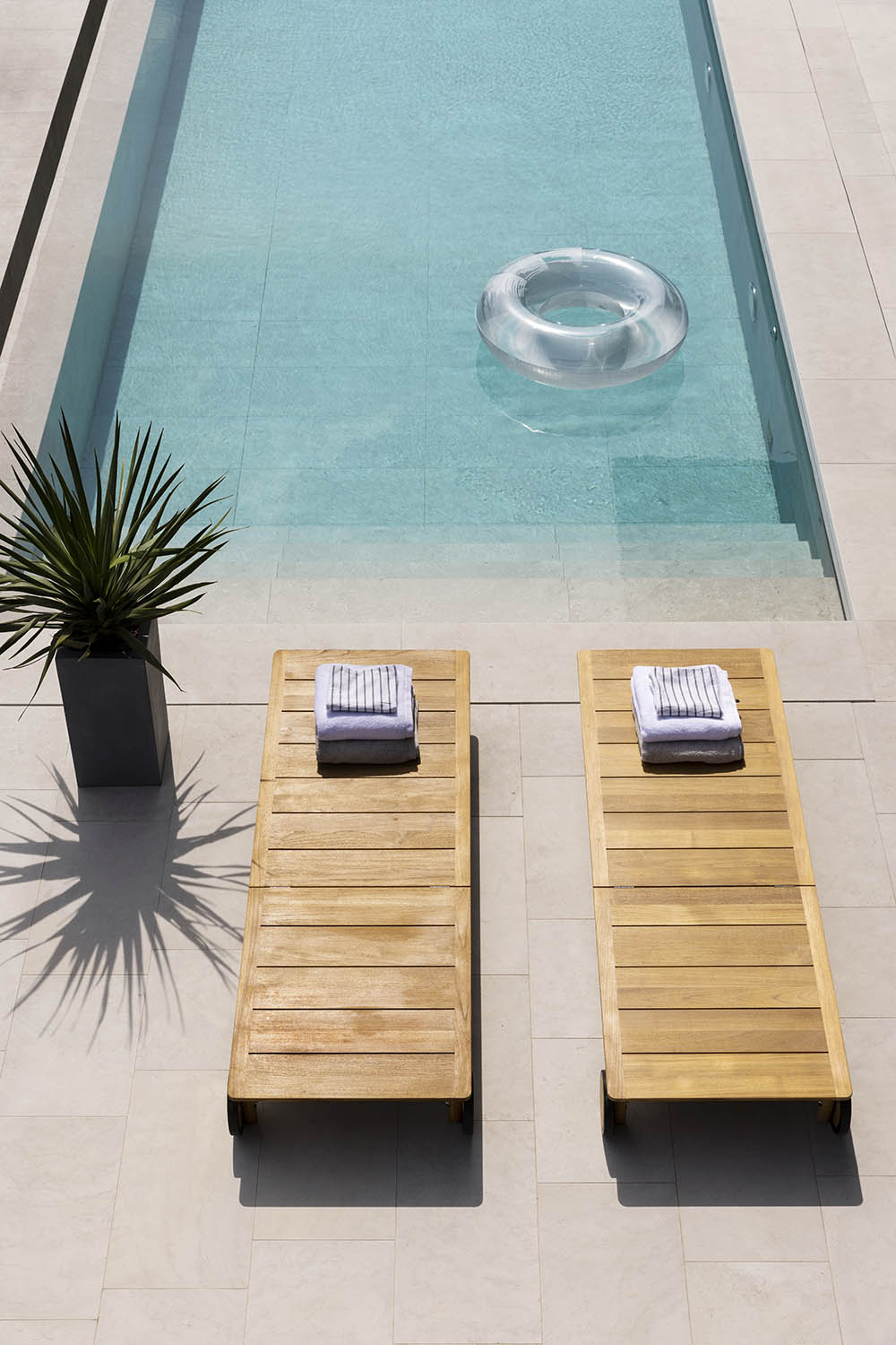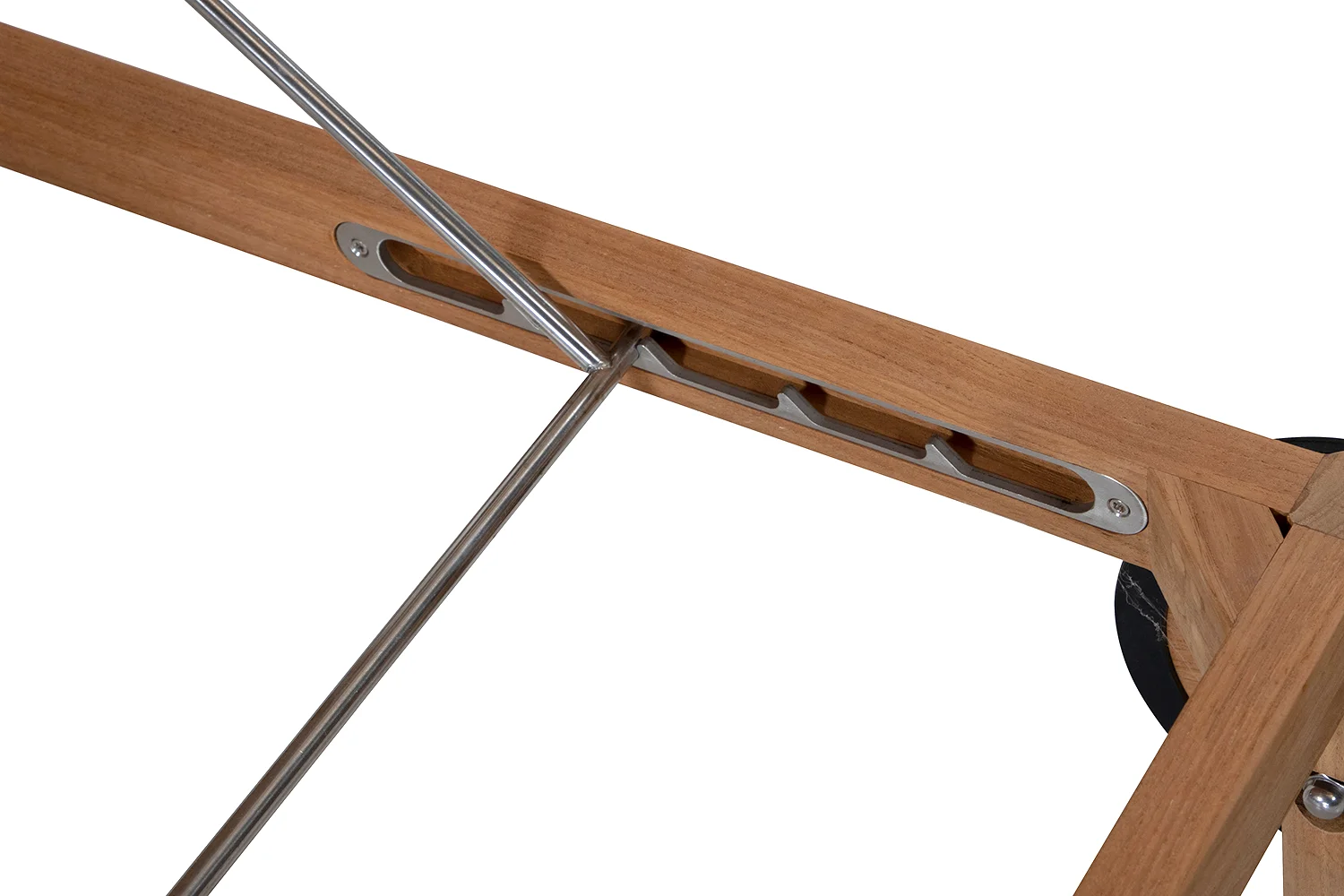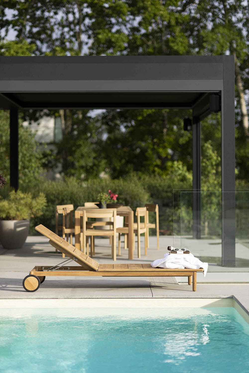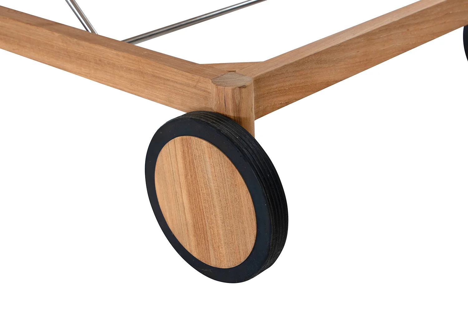 Koster solsäng i teak i klassisk skandinavisk stil med dyna i olefin-tyg i färgen Southend gråbrun.
