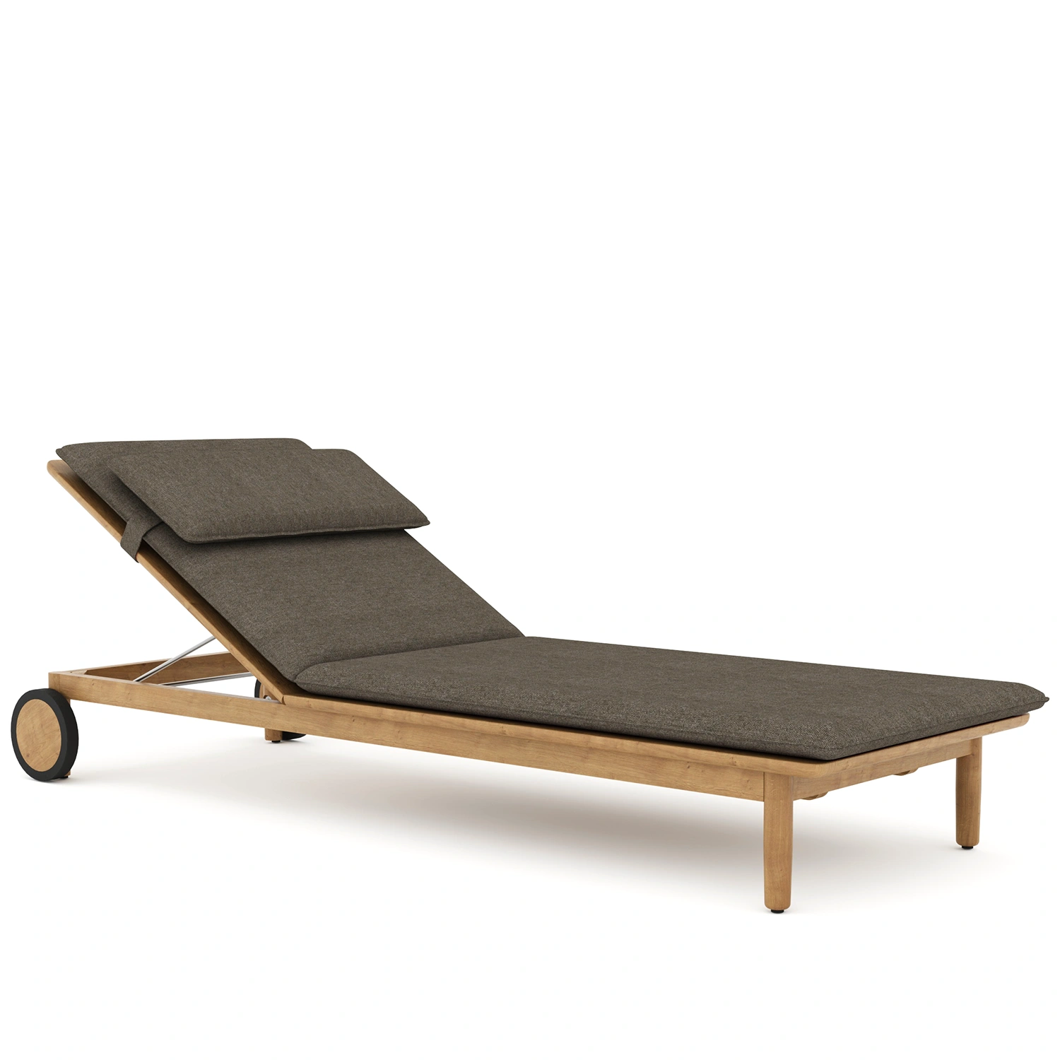 Koster solsäng i teak i klassisk skandinavisk stil med dyna i olefin-tyg i färgen Greyish Brown Southend.