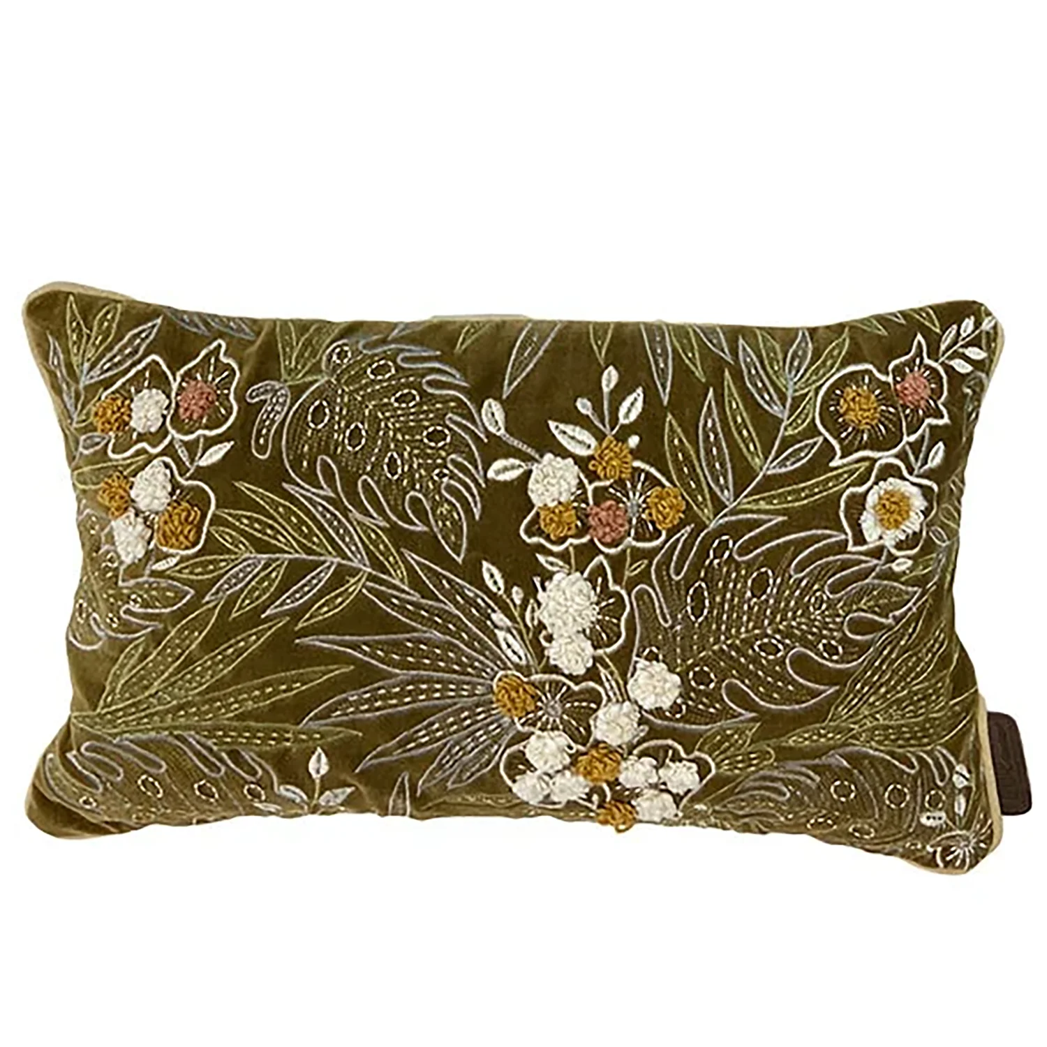 Denna vackra handbroderade kudde är tillverkat i mjuk sammet, broderat med vackra blommönster, och omgivet av passpoal i en kontrasterande färg, vilket ramar in kudden och ger den ett exklusivt utseende. Baksidan är gjord av bomull med en dold dragkedja som gör hela looken väldigt elegant. Många timmar har lagts ner på de handbroderade mönstren och kudden ger en personlig touch till din inredning, som är mycket lyxigt bohemisk.