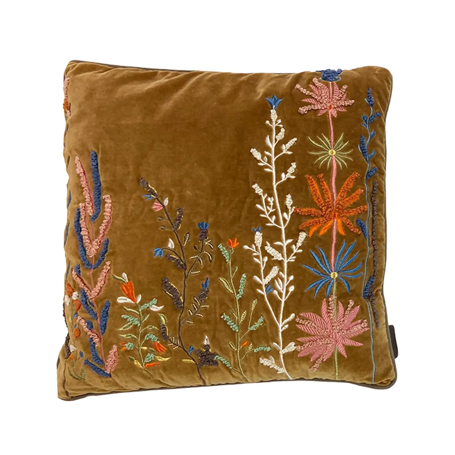 Detta vackra handbroderade kuddfodral är tillverkat i mjuk sammet, broderat med vackra blommönster, och omgivet av passpoal i en kontrasterande färg, vilket ramar in kudden och ger den ett exklusivt utseende. Baksidan är gjord av bomull med en dold dragkedja som gör hela looken väldigt elegant. Många timmar har lagts ner på de handbroderade mönstren och kudden ger en personlig touch till din inredning, som är mycket lyxigt bohemisk.