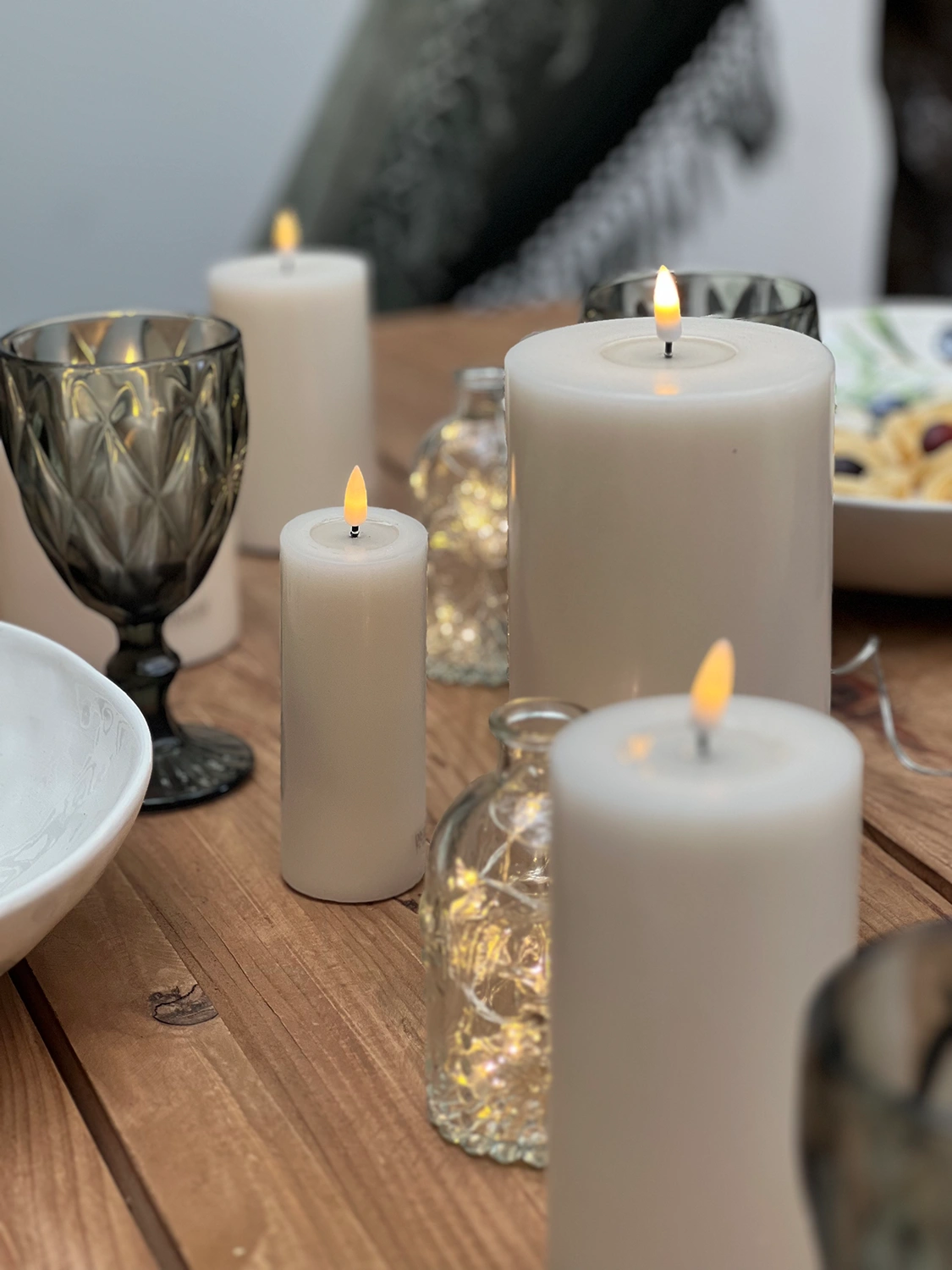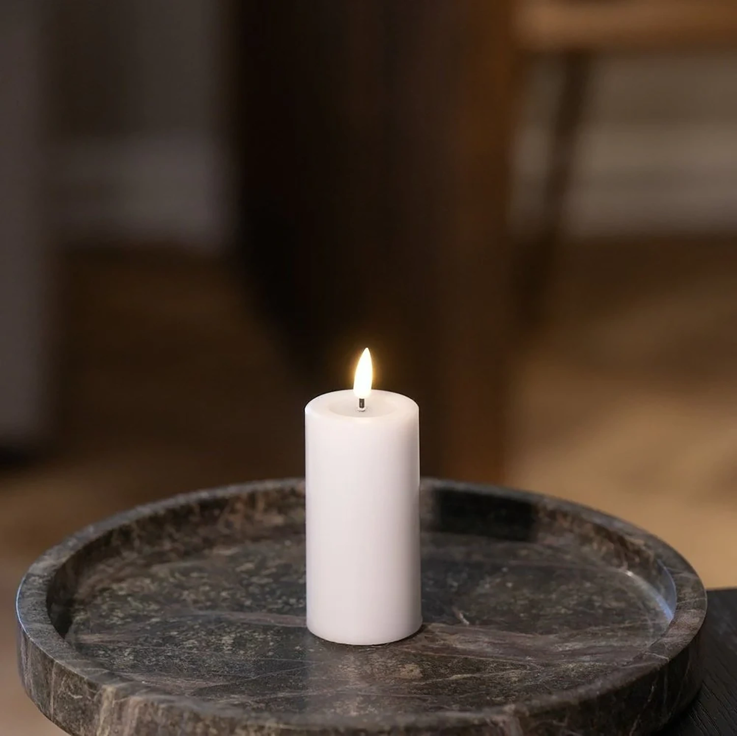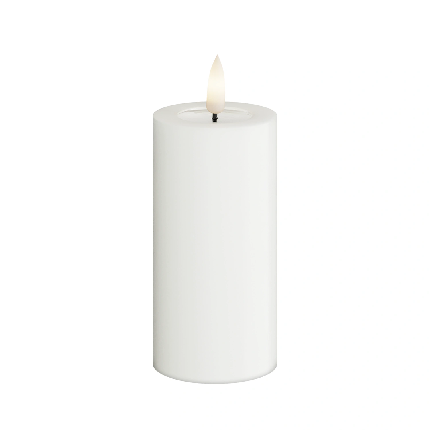 Blockljus för inomhusbruk i vit äkta stearin med mycket verklighetstrogen LED-låga.