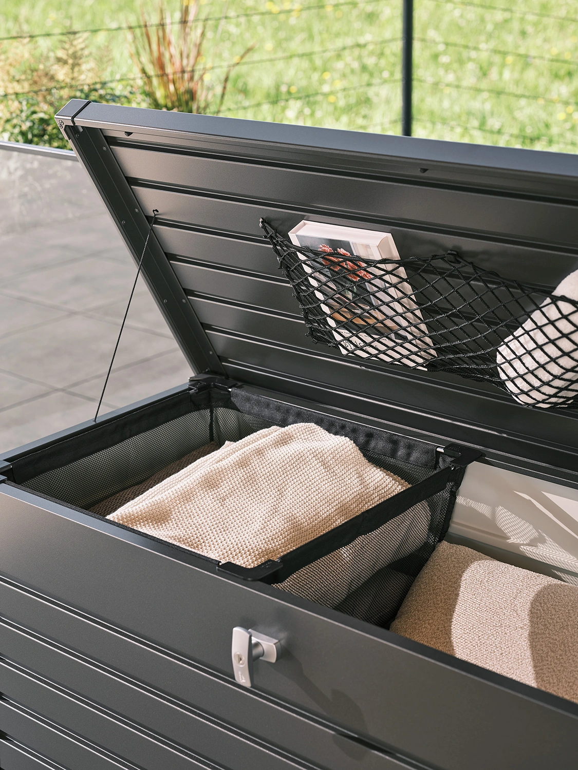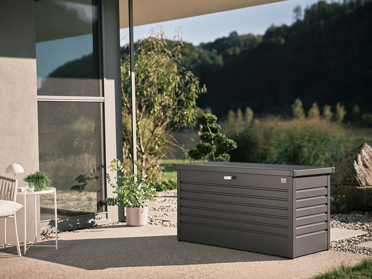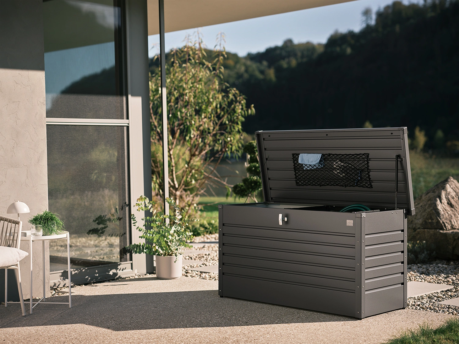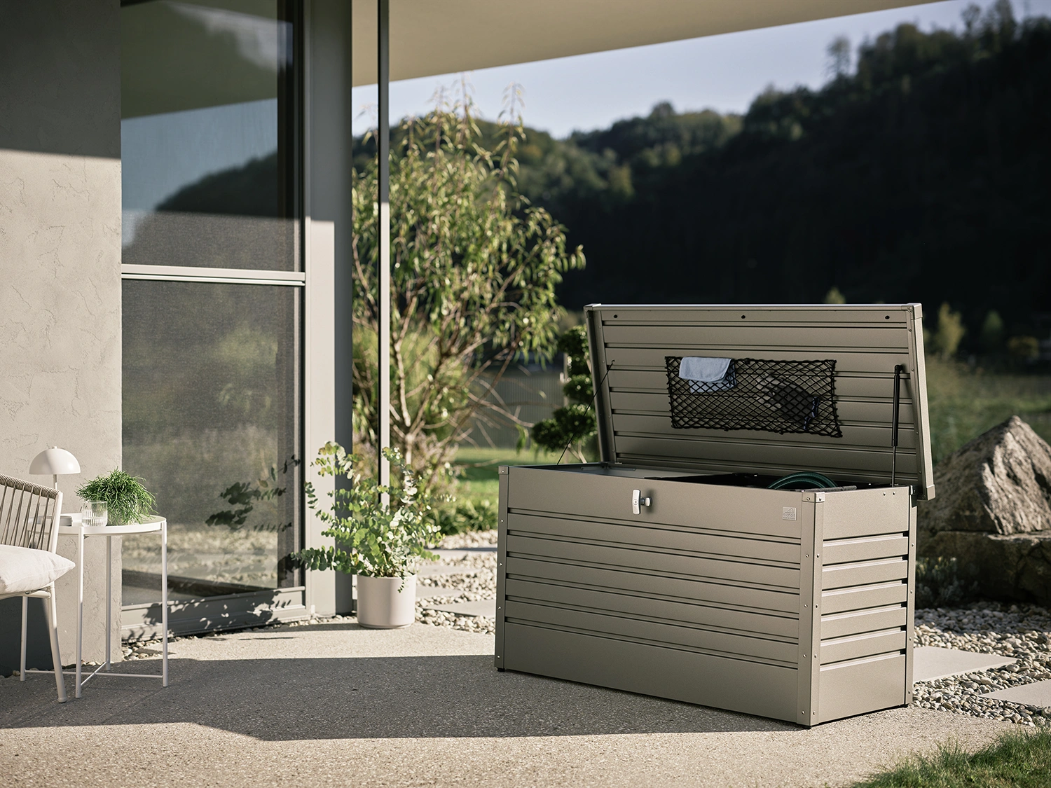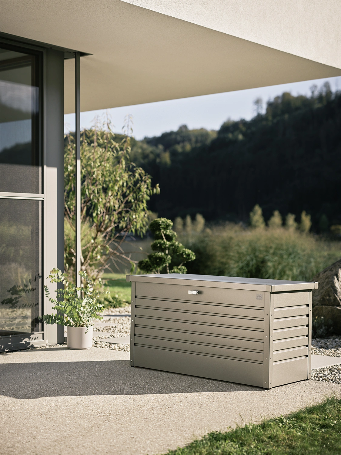 En underhållsfri, vattentät förvaringsbox från Biohort som ger dig bra förvaringsmöjligheter till dina dynor, solstolar, leksaker eller sportartiklar. Förvaringsboxen är tillverkad i galvaniserat och lackerat stål och har integrerad ventilation. Leisure Time finns i flera olika storlekar och visas här i dess minsta storlek, 130.