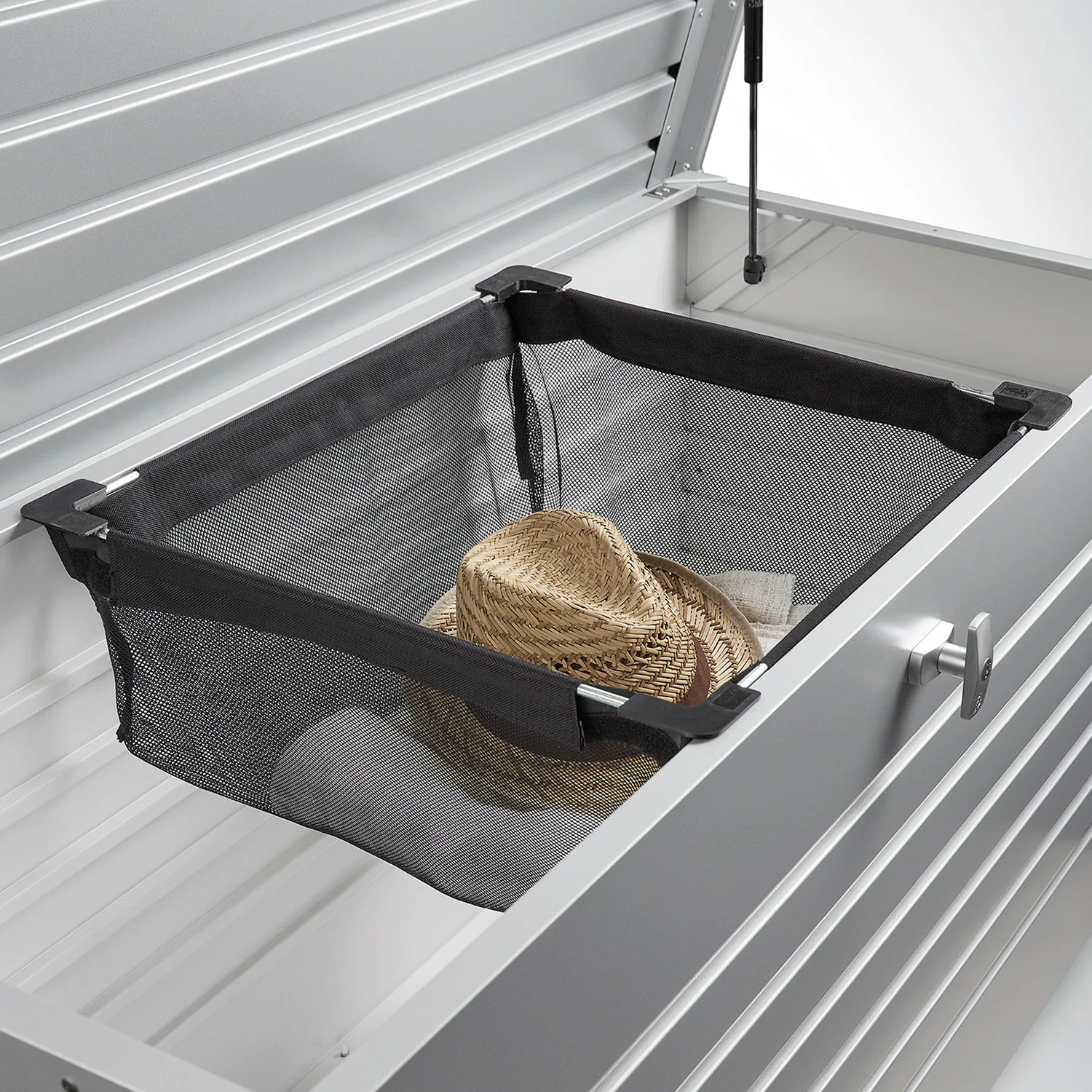 Komplettera din förvaringslåda från Biohort med en nätkorg som placeras ovanpå ramen för extra förvaringsutrymme. Korgen är tillverkad av svart polyesternät och har en maximal bärförmåga på 10 kg.