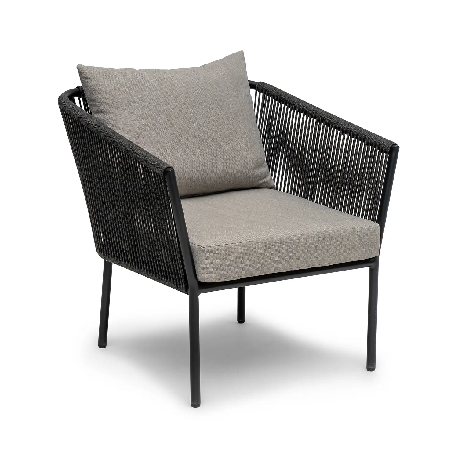 En nätt, modern och sofistikerad fåtölj för den lilla uteplatsen. Tillverkad i svart aluminium med flätade grå rep i olefin. Gråbeigea dynor med tyg i olefin.