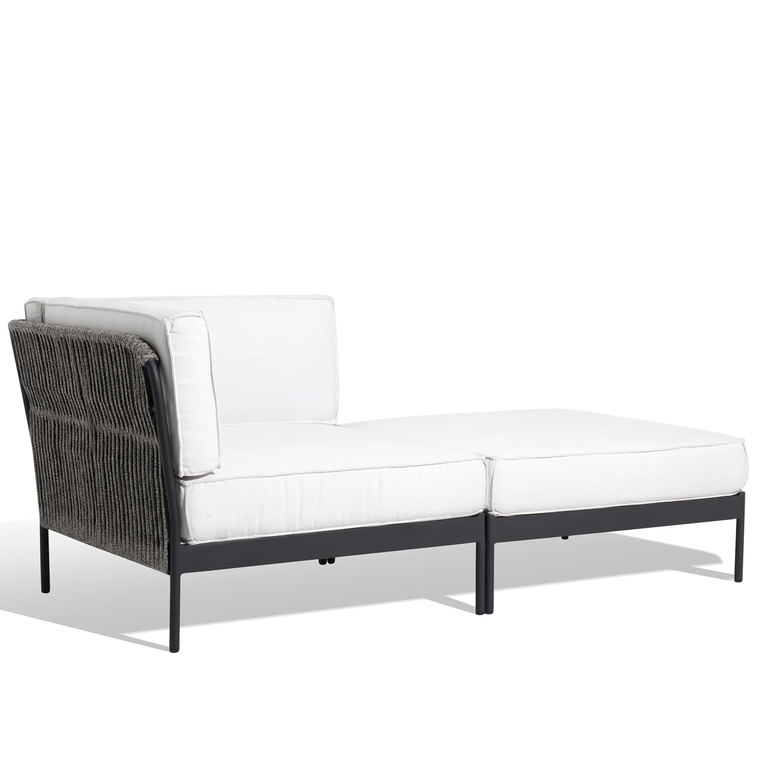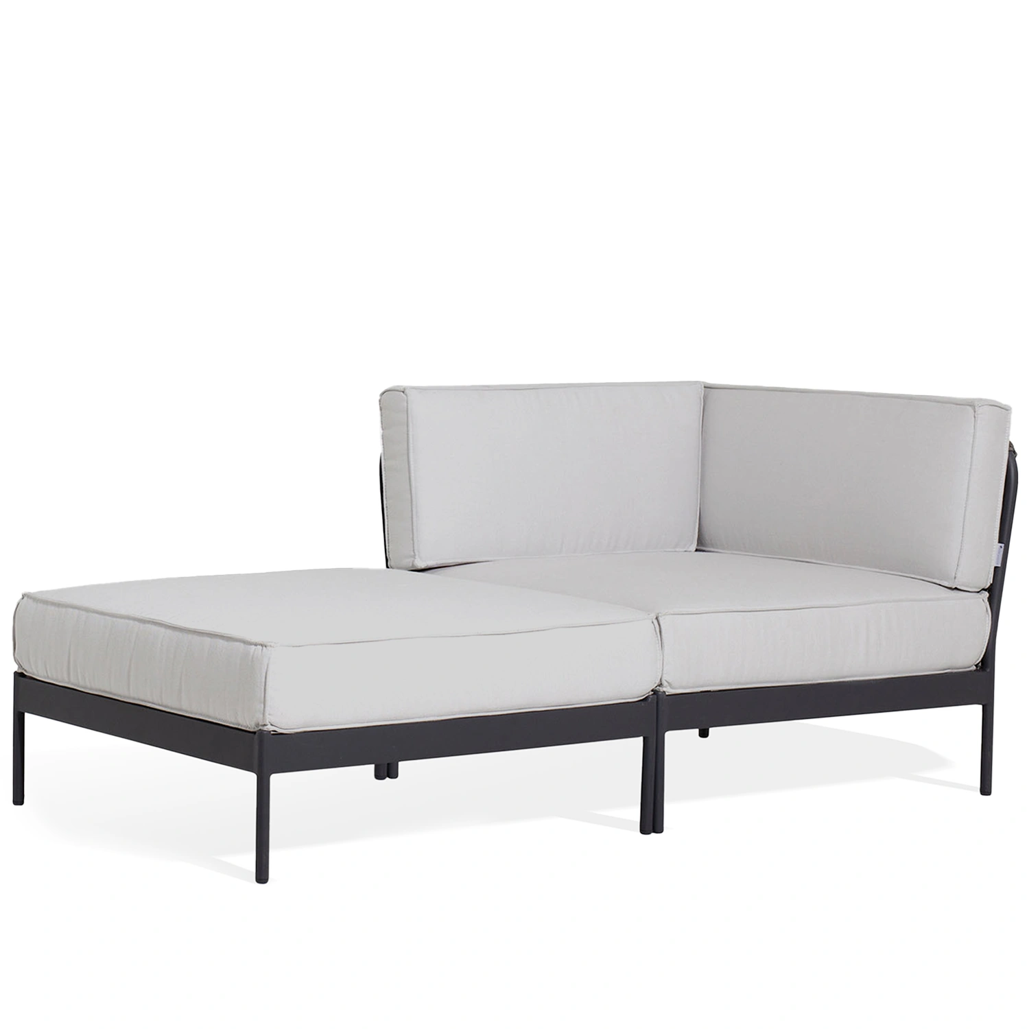 Lidö modulserie är tillverkad i aluminium, med smarta Sunbrella-tygklädda kuddar fyllda med utomhusskum av hög kvalitet. Den erbjuder stor komfort och ser lika bra ut i en trädgård som på en stor stadsterrass. Visas här med en hörndel och en ottoman.