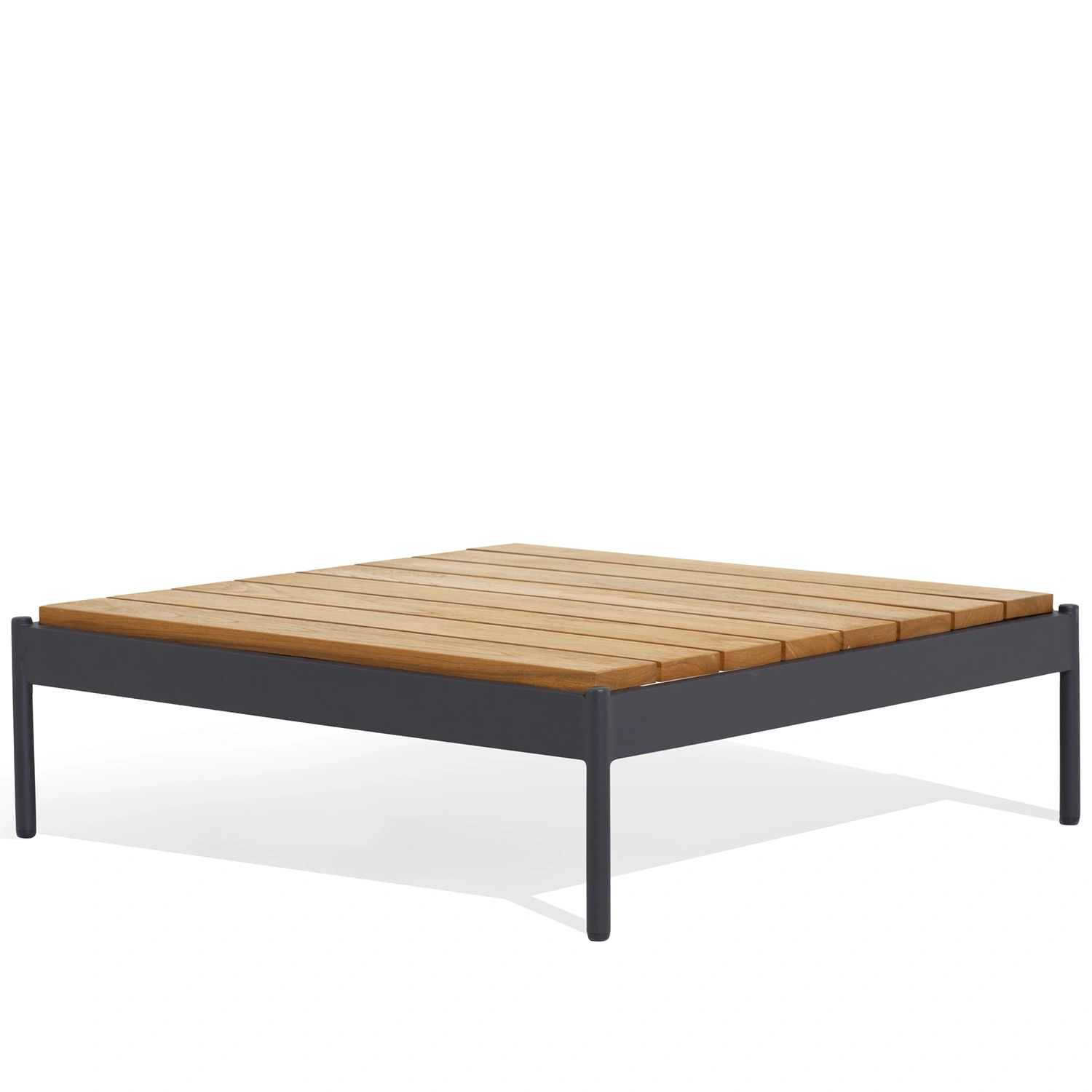 Lidö soffbord är ett stilrent och funktionellt komplement till loungemöblerna i Lidö-serien. Bordet är tillverkat i mörkgrå pulverlackerad aluminium med en bordsskiva i naturlig teak – ett material som åldras vackert och tål utomhusbruk. Den kvadratiska formen på 80×80 cm ger gott om plats för servering, dekorationer eller avslappnade stunder med en bok och en kopp kaffe.
