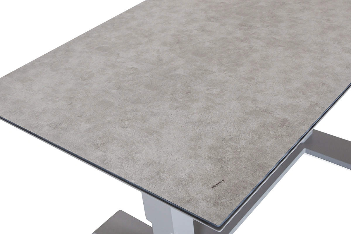 Stativ i pulverlackerad aluminium i färgen khaki. Bordsskivan är i glas med 3D-print som efterliknar en stenskiva.