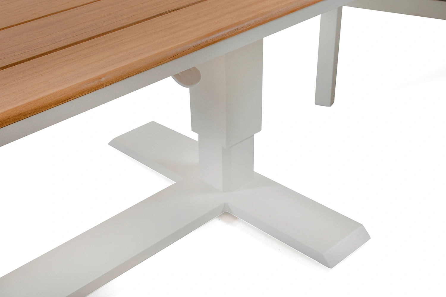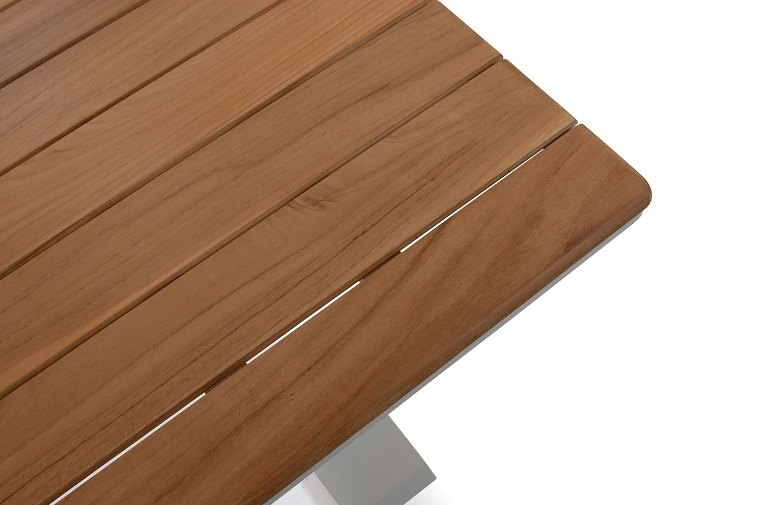 Stativ i pulverlackerad aluminium i färgen cream, som är en bruten vit/beige nyans som ger ett varmare intryck än kritvit aluminium. Bordsskivan är i teak, som man kan välja att olja för att behålla den gyllene färgen. Om man istället låter den vara ooljad så får man med tiden (och regelbunden rengöring) en vackert silvergrå träskiva.