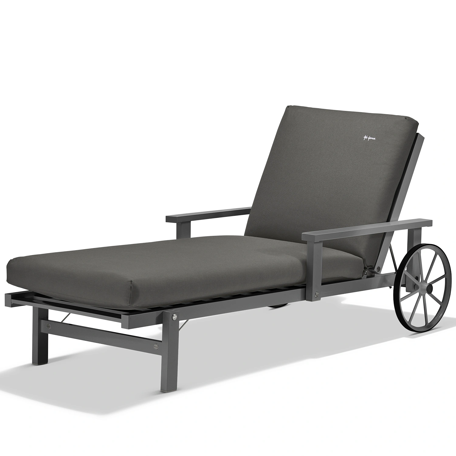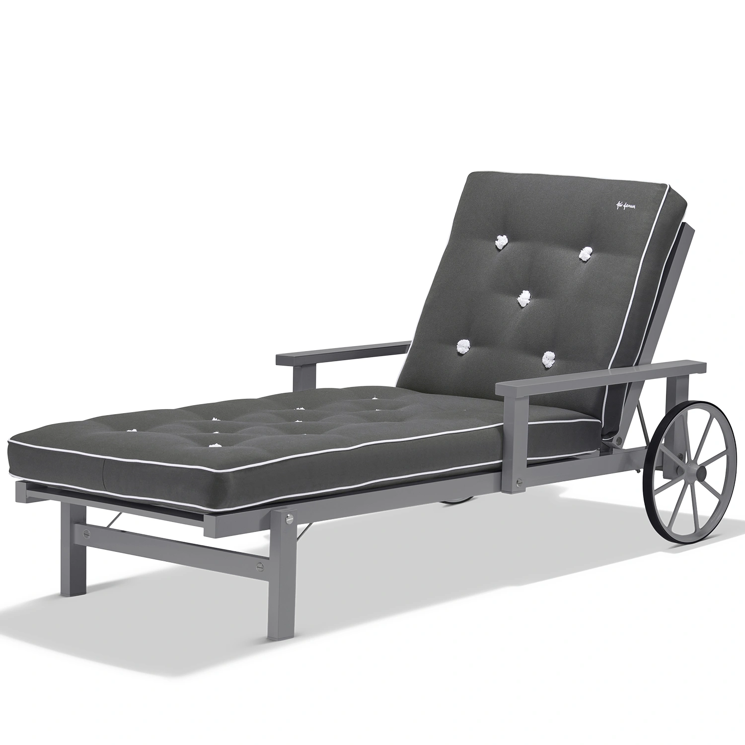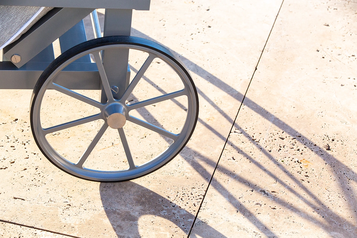 Fri Forms liggvagn 31 i grålackerad aluminium kombinerar klassisk design med praktisk funktion för utomhusmiljöer. Den robusta stommen är tillverkad i aluminium och epoxylackerad i en elegant grå finish som gör möbeln helt underhållsfri och mycket väderbeständig. Aluminiumets naturliga egenskaper gör liggvagnen lätt, rostfri och enkel att flytta, vilket gör den idealisk för det nordiska klimatet. Den behåller sin form och färg år efter år, oavsett om den placeras vid poolen, på altanen eller i trädgården.