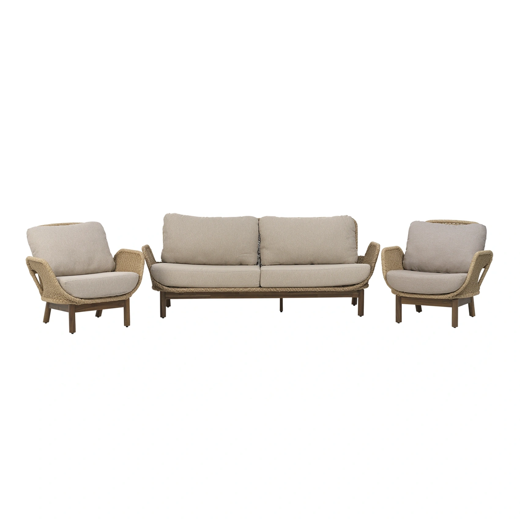 Lily soffgrupp med två fåtöljer och en soffa. Lägg till ett soffbord i teak för en komplett grupp.