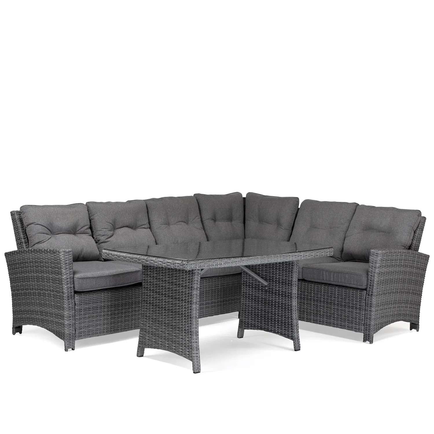 Liverpool är en hörnsoffa med lite högre sits vilket gör komforten mycket bra. Likaså är bordet högre vilket gör gruppen lika bra i en lounge som att äta vid. Liverpool har en kraftig stomme i aluminium och är klädd med grå konstrotting, dynor av kraftig grå olifinväv.