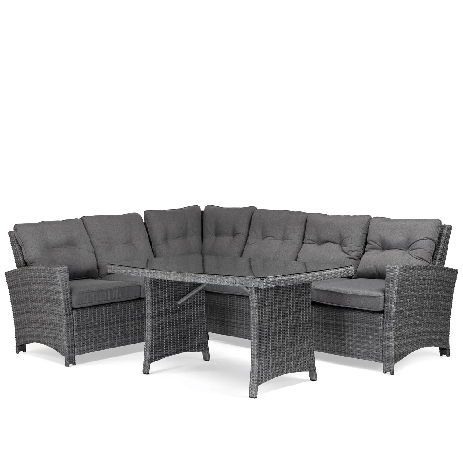 Liverpool är en hörnsoffa med lite högre sits vilket gör komforten mycket bra. Likaså är bordet högre vilket gör gruppen lika bra i en lounge som att äta vid. Liverpool har en kraftig stomme i aluminium och är klädd med grå konstrotting, dynor av kraftig grå olifinväv.