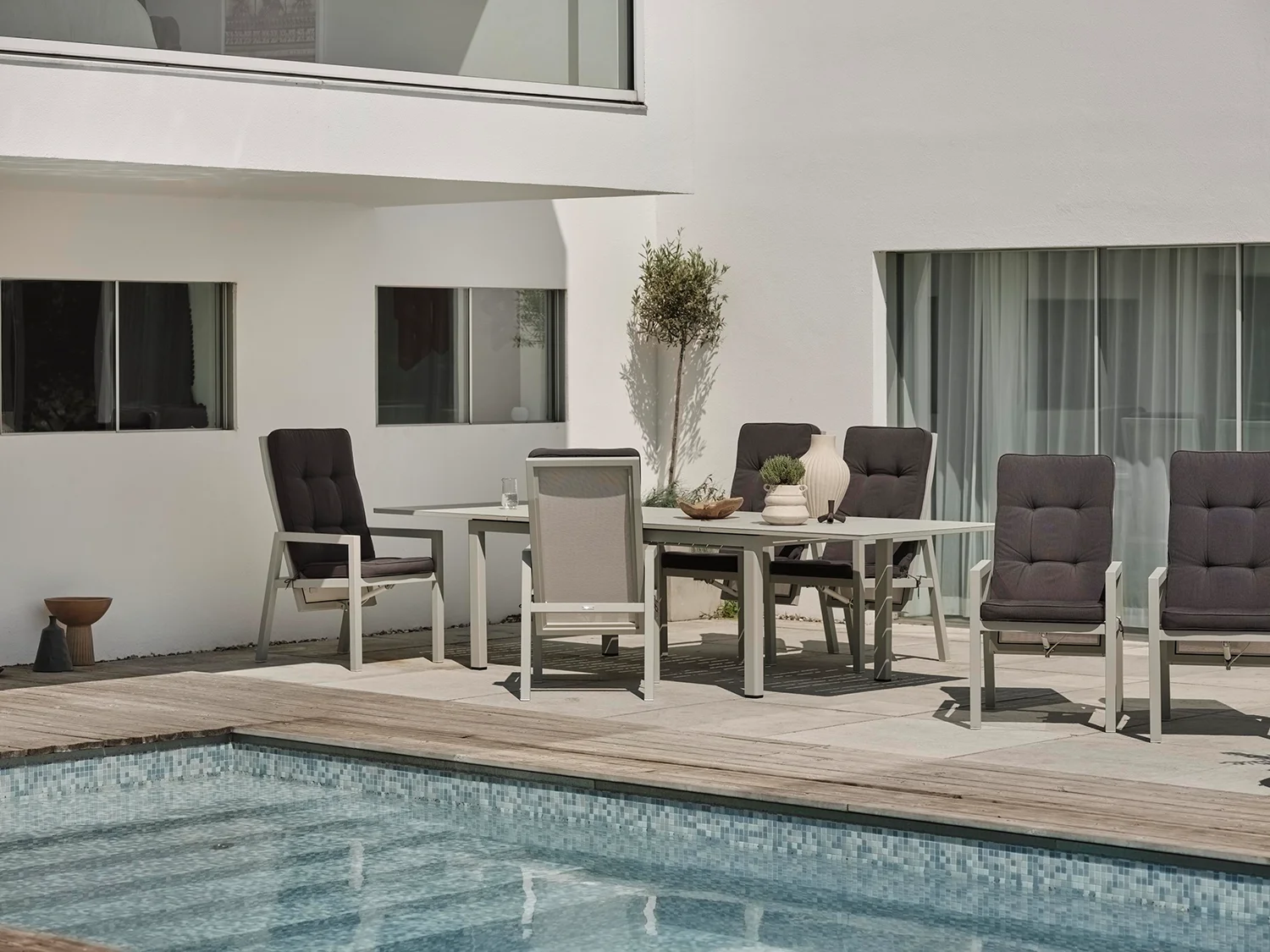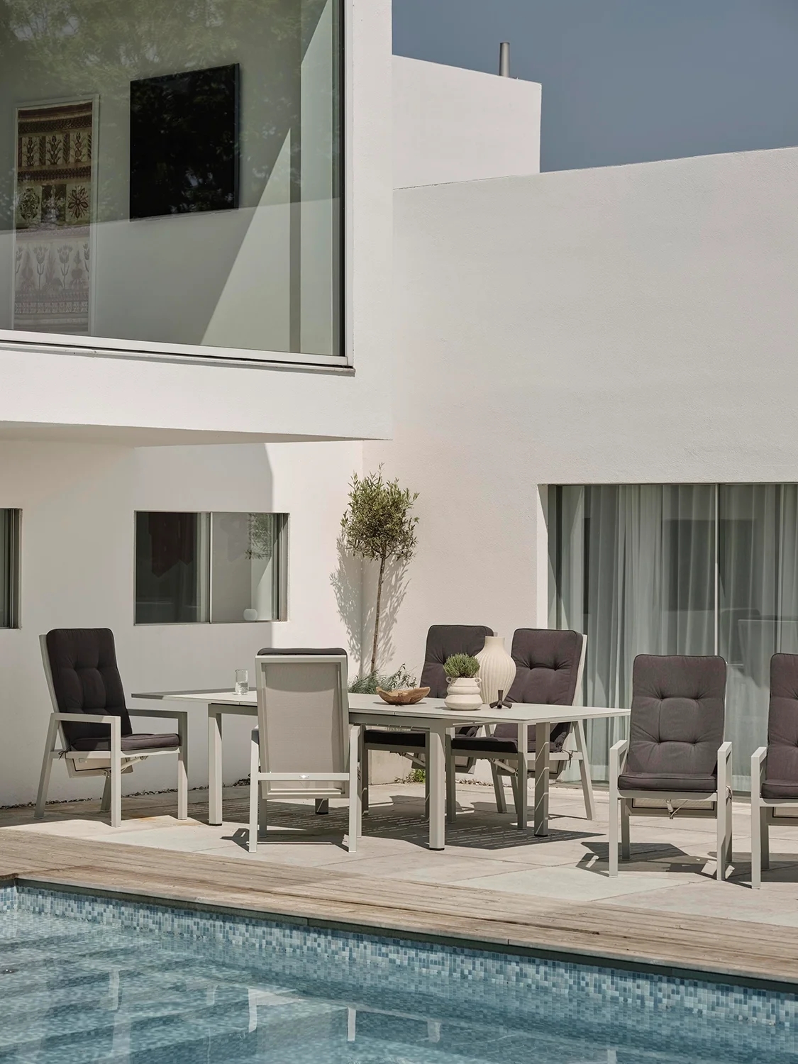 Ett aluminiumbord med extra allt. Det eleganta ribbmönstret ger en känsla av trygghet. Och det är på längden Lomma sticker ut extra – 194 centimeter ihopfällt och imponerande 312 centimeter utfällt (mått mellan ben är 173,5 cm). Design och funktion i ett härligt samspel.