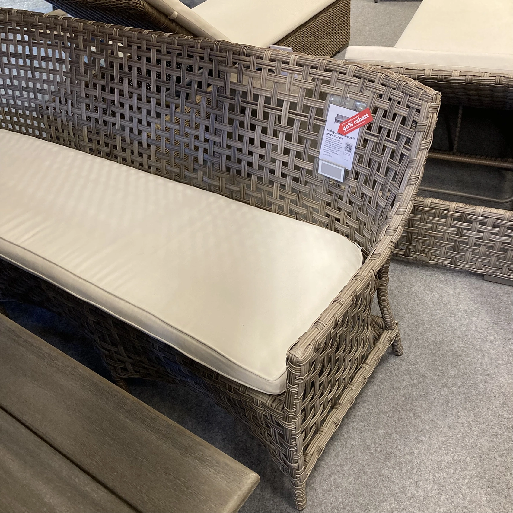 Malaga är en snygg soffa för matbord från Artwood i den gråa väderbeständiga konstrottingen Classic Grey. Soffan har en stomme av aluminium. Vit sittdyna med avtagbar klädsel i 100% polyester ingår. Dynstoppning av en polyeterkärna med svept fiber och riven polyeter.
