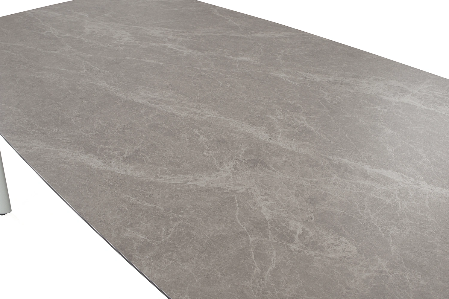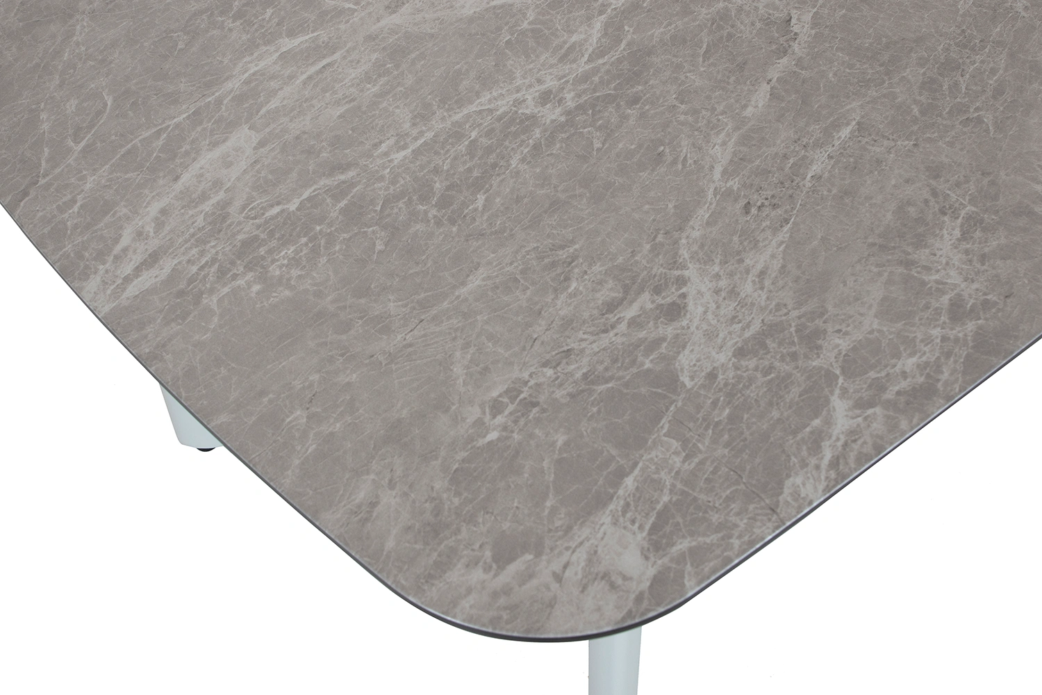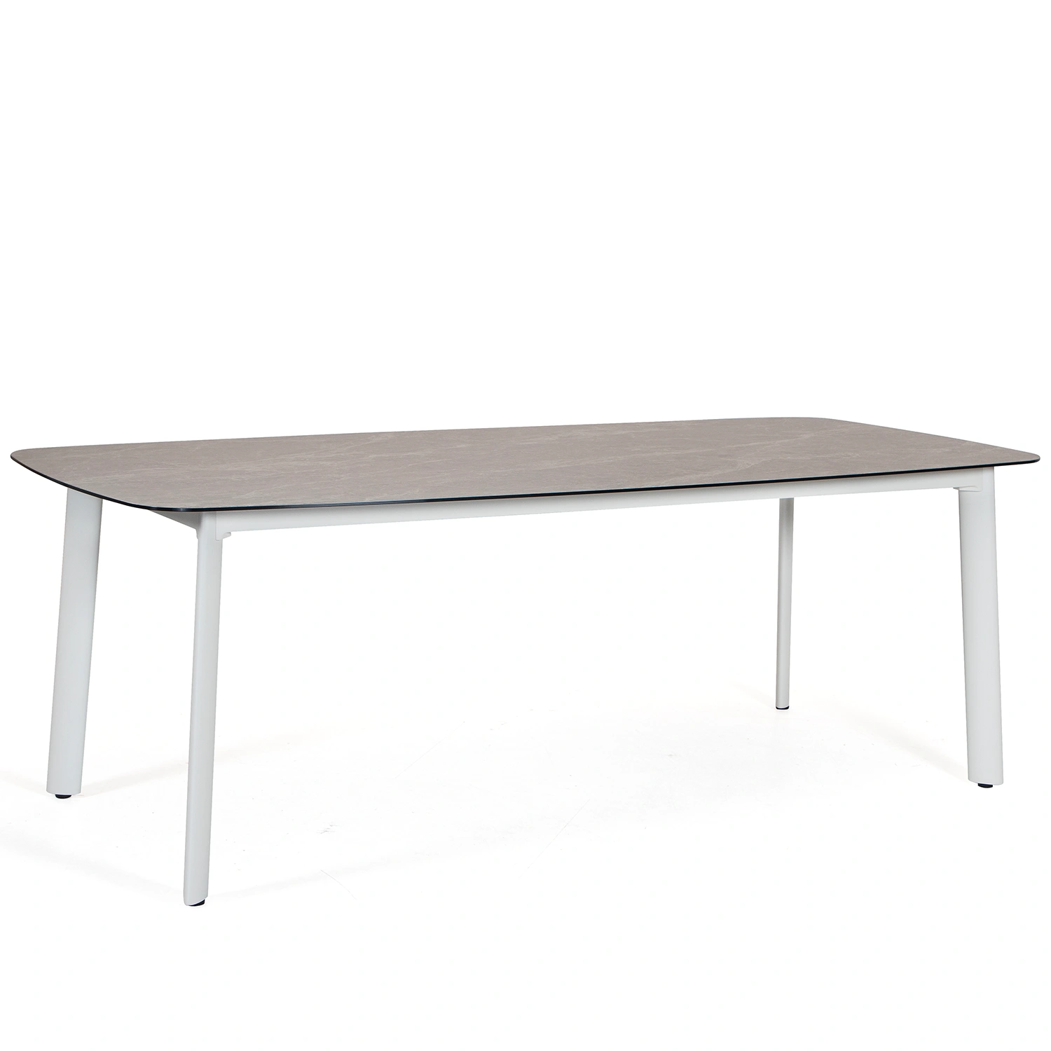 Malton matbord i aluminium med bordsskiva i glas med grå/beige 3D-print som efterliknar sten. Rundade hörn ger bordet en mjukare form.
