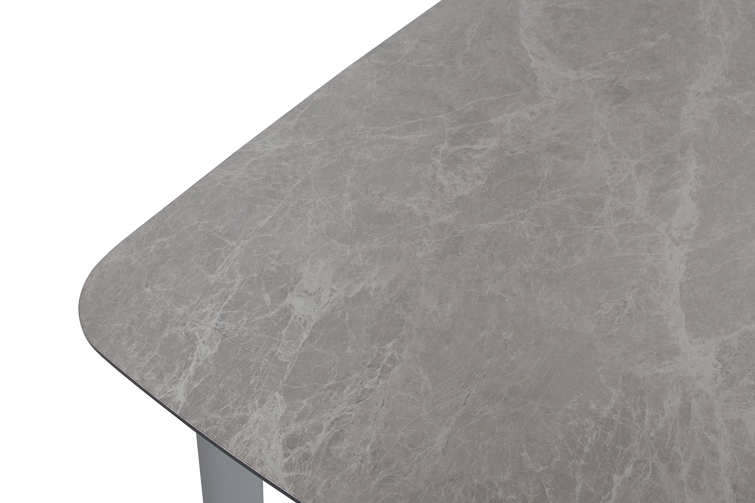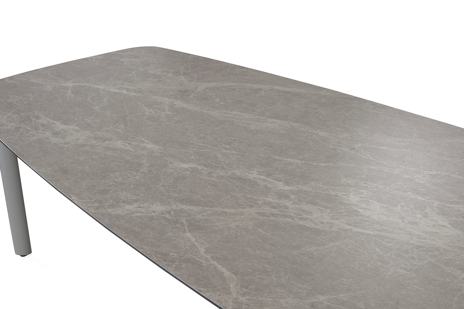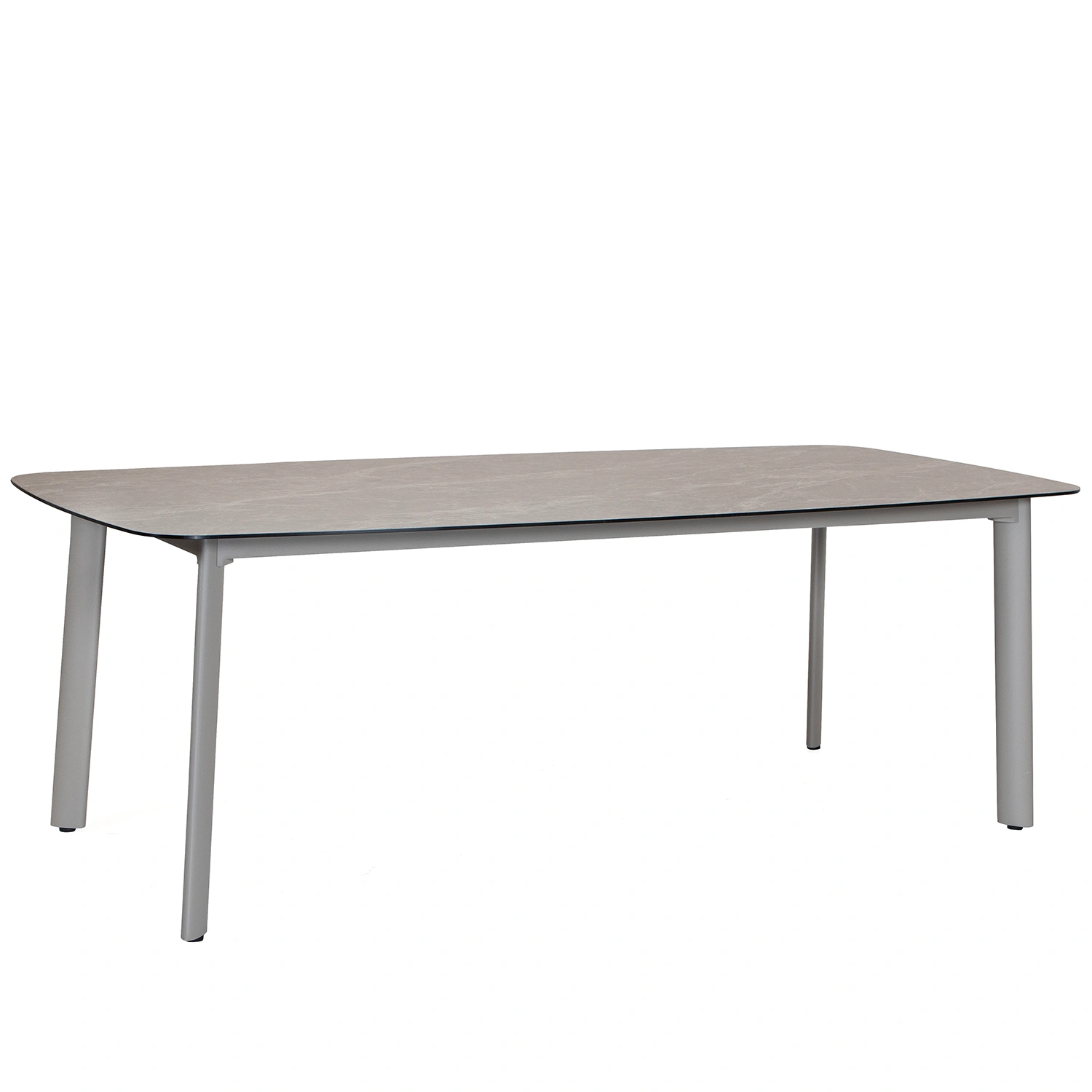 Malton matbord i aluminium med bordsskiva i glas med grå/beige 3D-print som efterliknar sten. Rundade hörn ger bordet en mjukare form.