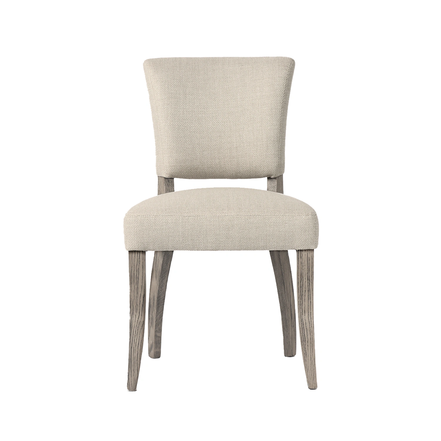 Den mjukt vadderade sitsen och den lätt böjda ryggen gör stolen bekväm även vid längre måltider. Benen i massivt trä skapar en fin kontrast mot det beige tyget och förstärker det moderna uttrycket.