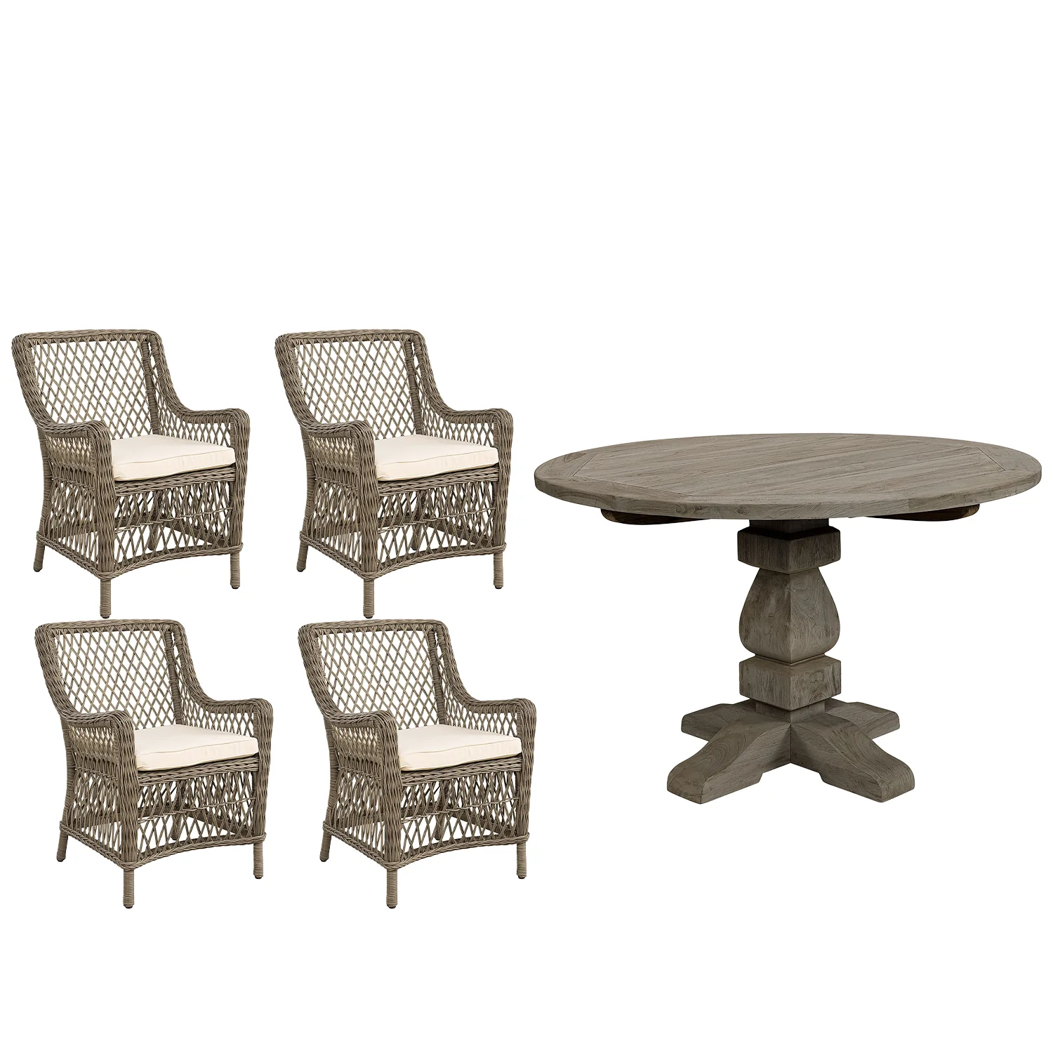 Marbella matgrupp med det massiva matbordet French från Artwood. Romantisk grupp i grå väderbeständig konstrotting och teak.