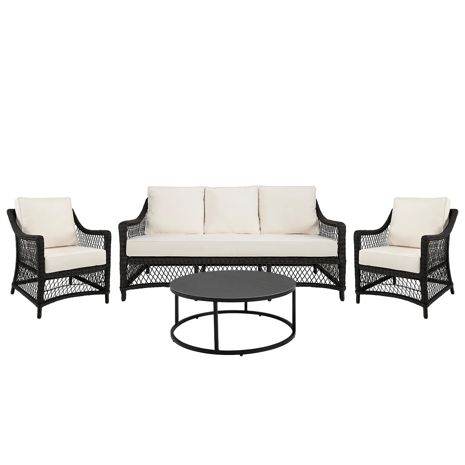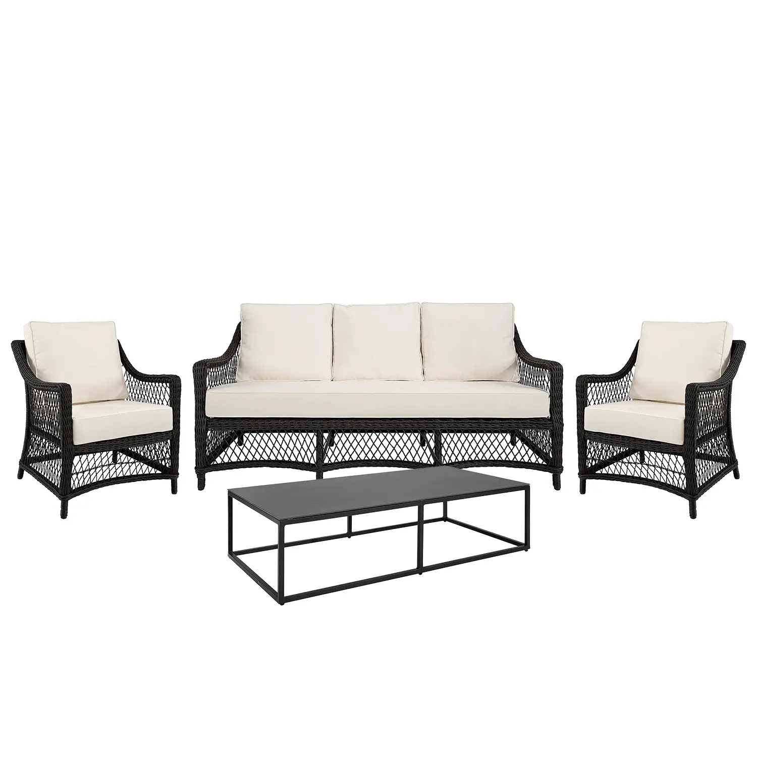 Marbella är en snygg soffgrupp från Artwood, här i svart väderbeständig konstrotting. Soffan har en stomme av aluminium. Vita dynor med avtagbar klädsel i 100% polyester ingår. Soffbordet Romano har ett pulverlackat stativ i stål med bordsskiva i stenkomposit. Bordet finns att välja i olika utföranden.