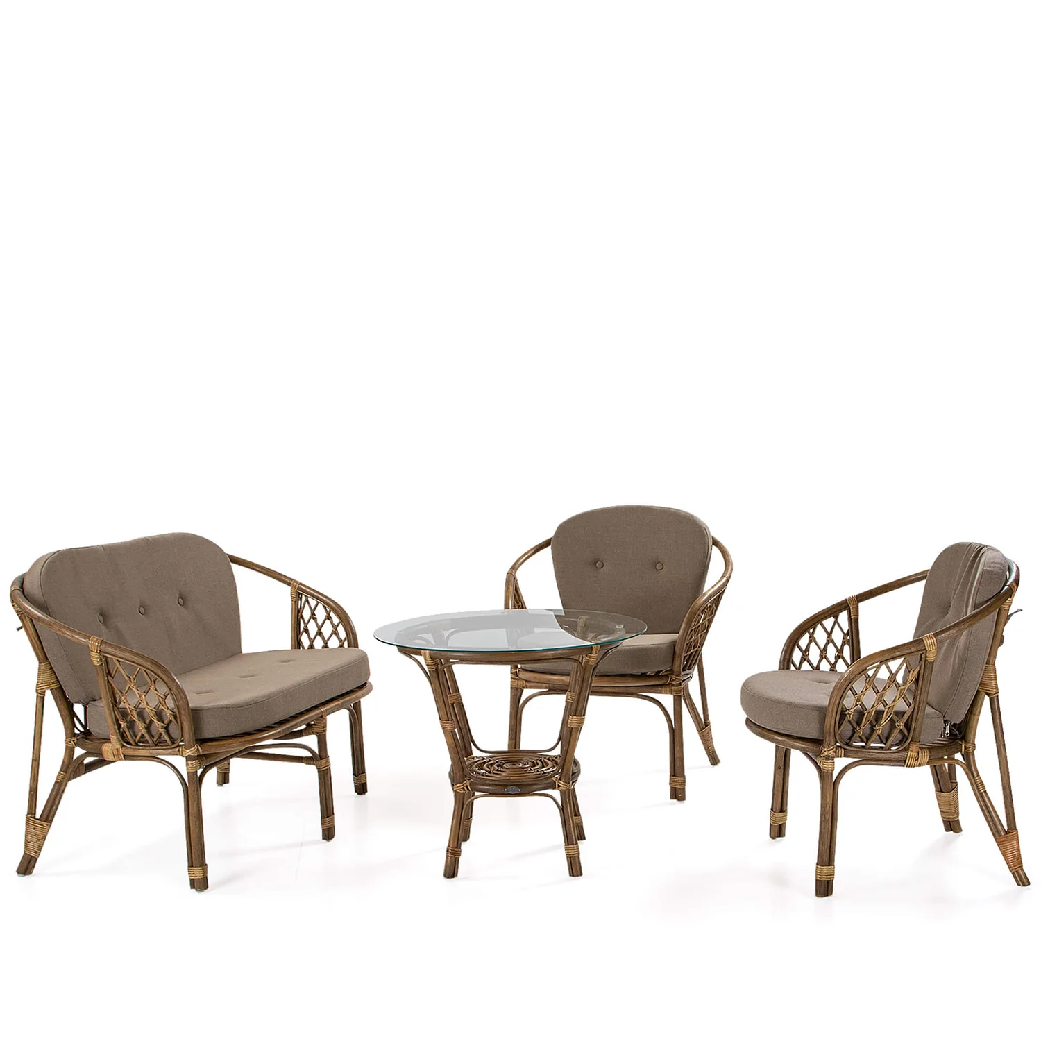 Maria är en liten nätt och prisvärd rottinggrupp med 2-sits soffa, fåtölj och bord. De blå dynorna som ingår i gruppen är sydda i kraftigt olefin-tyg. Rottingen är lätt brunlaserad. Den förvalda gruppen består av 2 st. fåtöljer, soffa samt bord, vill du beställa en annan sammansättning kan du göra det längre ner på sidan, priserna blir detsamma. Gruppen går även att få med blå dynor.