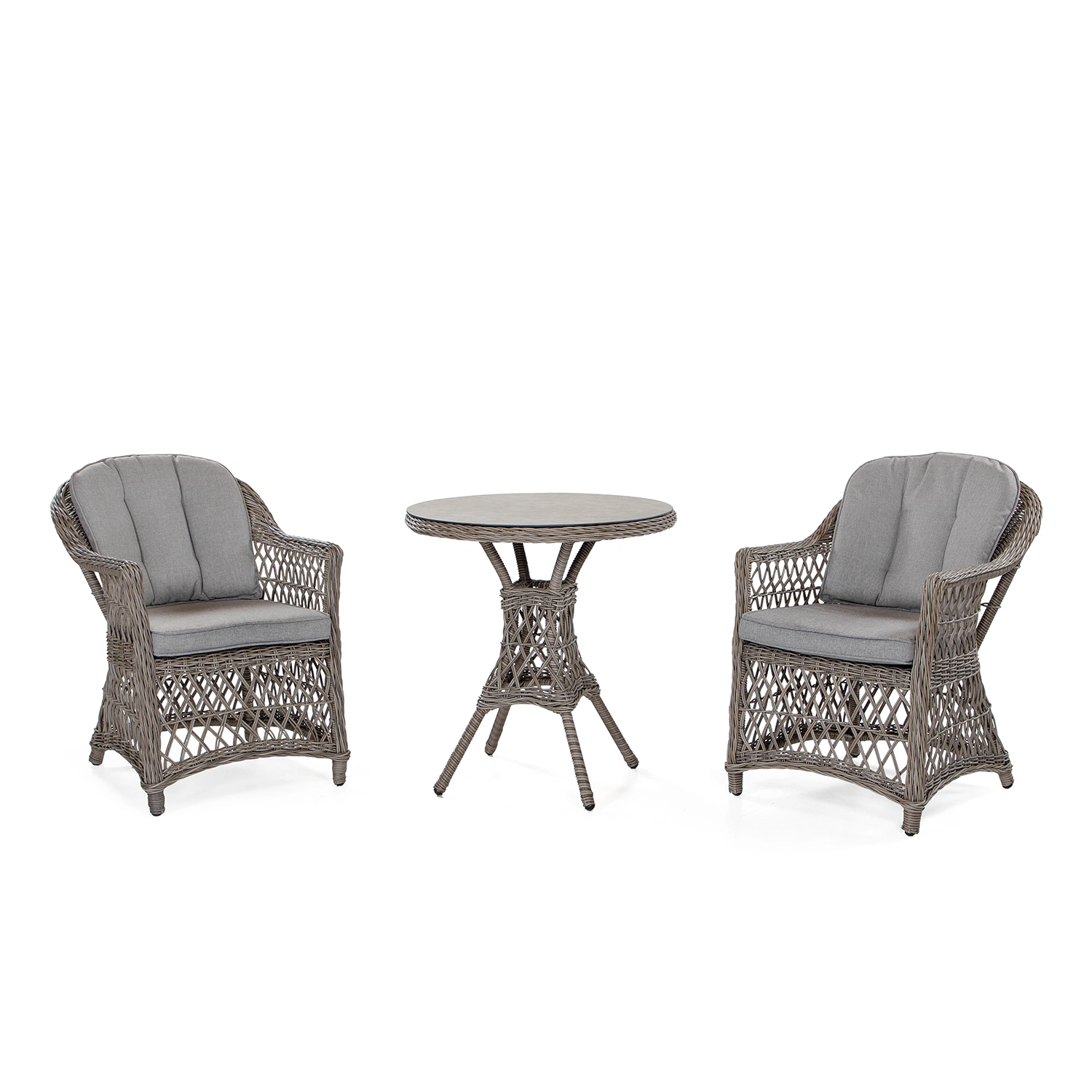 Marienlyst karmstol i drivvedsfärgad konstrotting tillsammans med cafébord i storlek Ø70 cm. Sits- och ryggdyna i tålig olefinväv till stolarna ingår. Både bordet och stolarna har en rund, drivvedsfärgad tråd. I gruppen ingår 2 fåtöljer med sitt- och ryggdynor samt 1 bord.