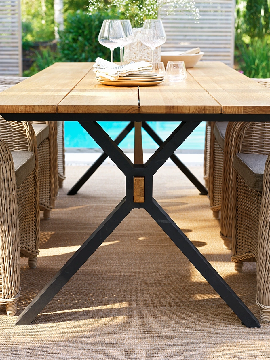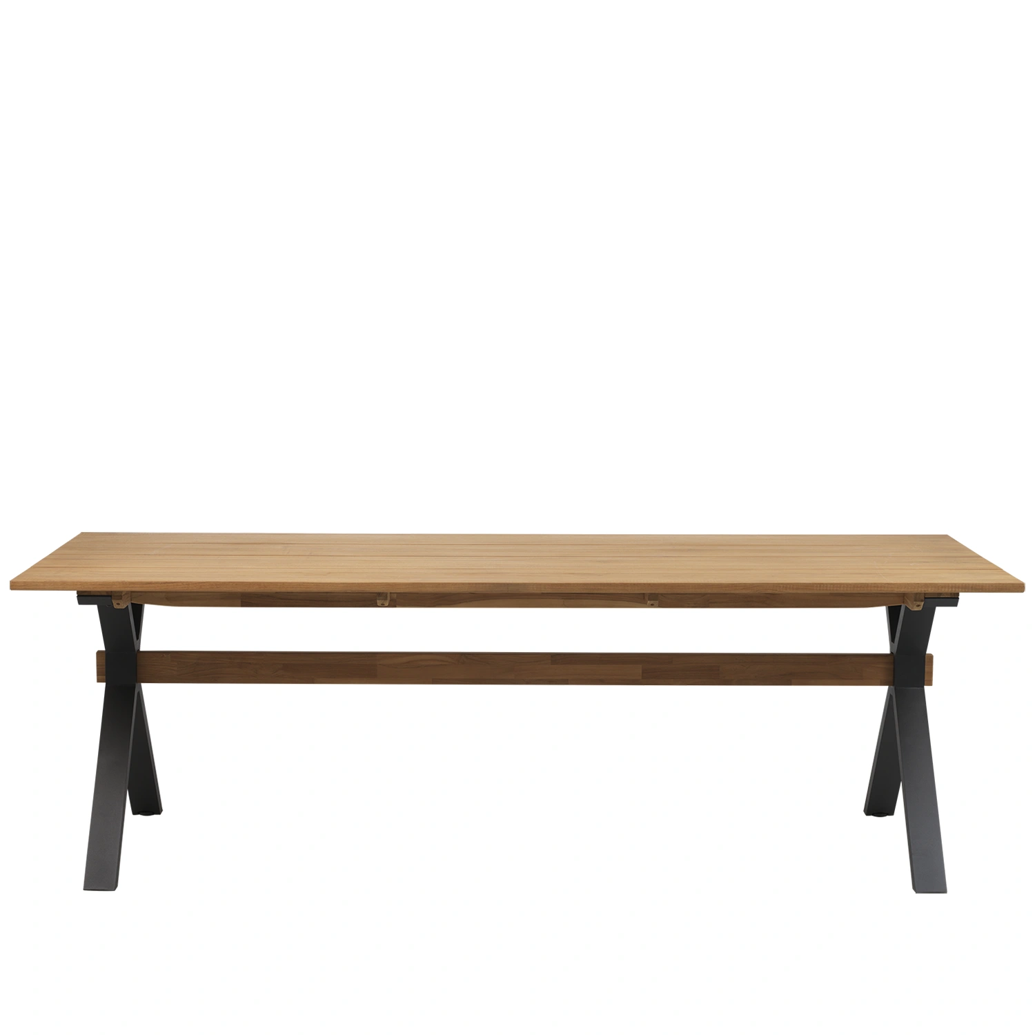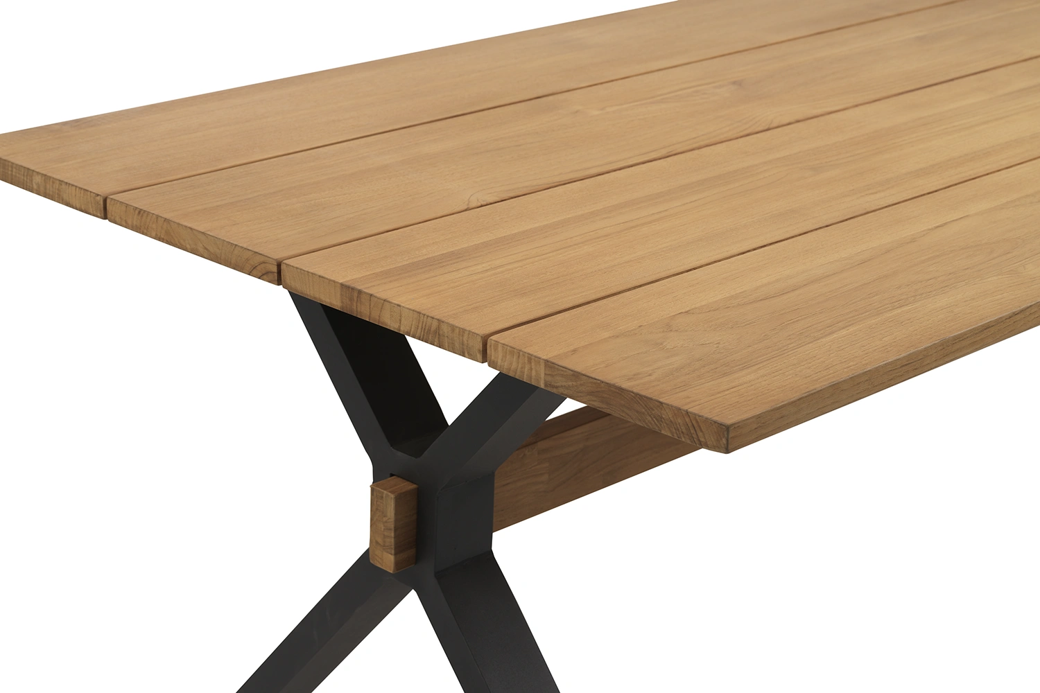 Mark är ett matbord där rustik värme möter industriell känsla. Den massiva teakskivan kombineras med kryssben i aluminium och skapar en kraftfull mix av naturligt och modernt.