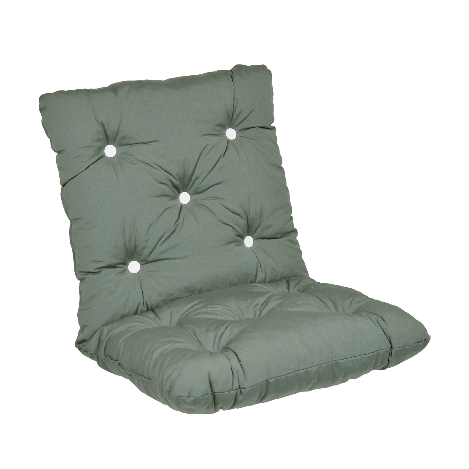 Minivik visas här i mossgrönt tyg i Dralon. Dralondynor är mycket tåliga mot solblekning och kommer att hålla färgen i många år. Dynan har vita knappar i plast i rygg och sits.